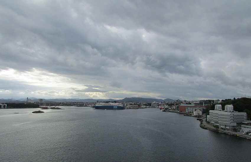 Majestätisch nähert sich unser schönes Schiff seinem Liegeplatz - in Stavangers "Pole Position" mitten im Zentrum und damit als höchstes "Gebäude" der Umgebung.