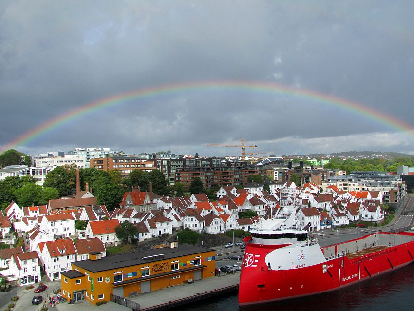 Und dann … - Als wolle die Stadt Einiges wieder gutmachen - dafür, dass sie mich schon so oft mit Regenwetter und bedecktem Himmel empfangen hat, schickt der launische norwegische Wettergott doch tatsächlich einen Regenbogen! - Einen Regenbogen über den schneeweißen Häuschen von Stavangers Altstadt! Wie wunderschön! Wie traumhaft! "Somewhere over the Rainbow" … Dieser Titel fällt mir hierzu ganz spontan ein. "Der Zauberer von Oz" hätte es nicht besser machen können.