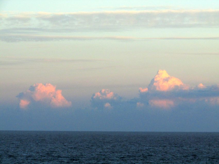 Gegen 06:00 Uhr: Die Sonne geht heute auf der Backbordseite auf, wenn sie durch die vielen Wolken überhaupt zu sehen ist. Der Horizont mit den rosé-orange angestrahlten "Schlagsahnewolken" sieht ja noch vielversprechend aus.