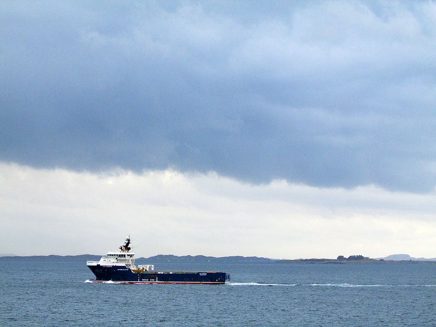 Heute zieht eine dunkelgrau getünchte Schärenkulisse vor einem hellgrau gefärbten Horizont unter einem sich malerisch in mausgrau ausbreitenden Himmel vorbei. Selbst das vorbeiziehende, knapp 80 Meter lange und auf den Namen "Stril Mermaid" hörende Versorgungsschiff mit Heimathafen Brønnøysund in Norwegen scheint alles für die perfekte Tarnung in diesen Grau-Nuancen zu geben: dunkelblau mit grau.