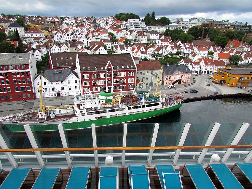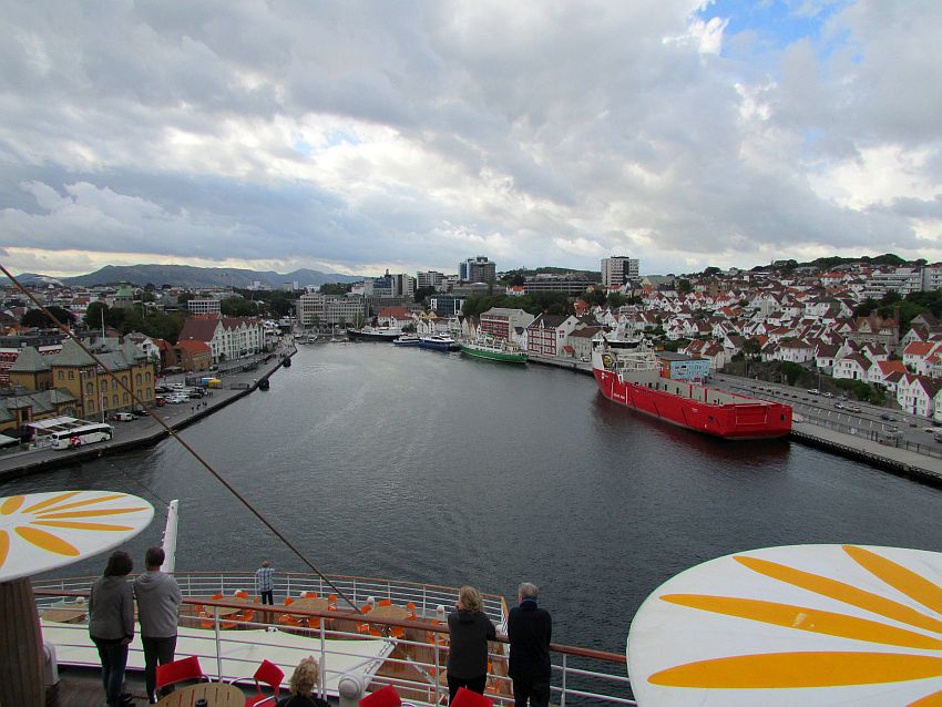 Majestätisch nähert sich unser schönes Schiff seinem Liegeplatz - in Stavangers "Pole Position" mitten im Zentrum und damit als höchstes "Gebäude" der Umgebung.