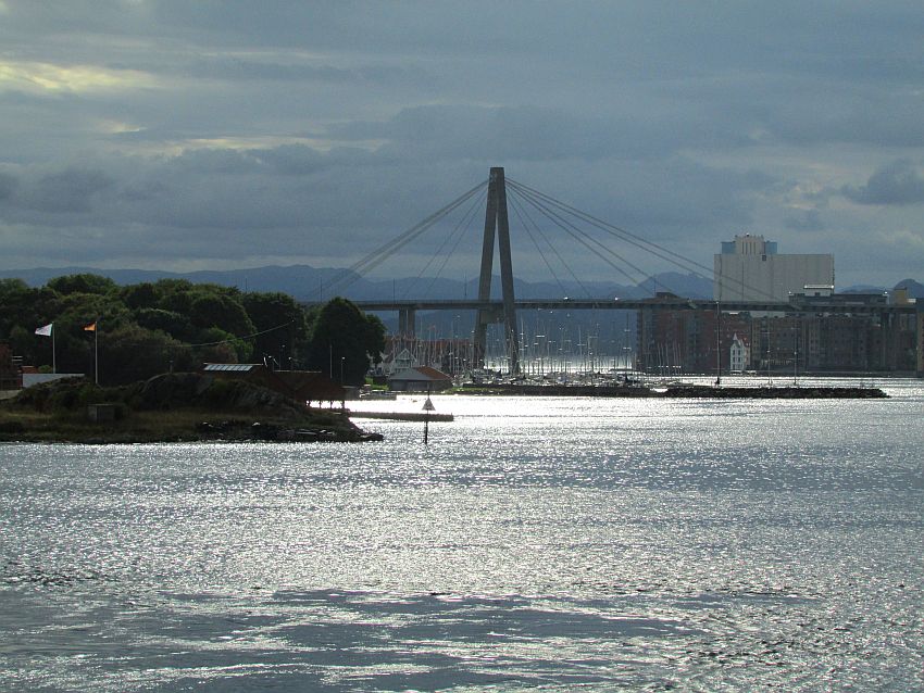 Die Sonne blinzelt noch etwas verhalten zwischen einer überschaubaren Anzahl an Wolkenlücken hervor. Im Gegenlicht breitet sich über silbern glitzerndem Wasser die "Stavanger bybru" vor einer dunklen Wolkenfront aus.