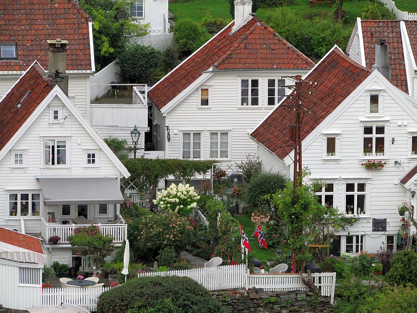 Einladend sieht es hier überall aus. Aus unserer erhöhten Perspektive von der Reling des Pooldecks mutiert man automatisch zum "Voyeur", wenn man in die kleinen liebevoll bepflanzten und mit norwegischen Flaggen geschmückten Gärtchen schauen kann.