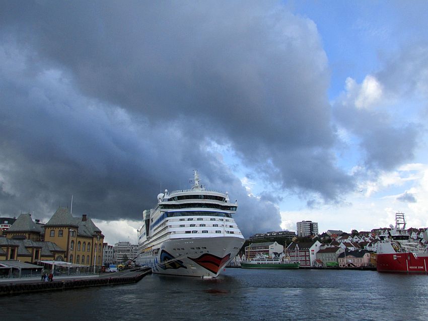 Während ich noch so stehe und staune, hat sich unser Schiff so butterweich an die Fender geschmiegt, dass ich es gar nicht mitbekommen habe: Wir sind angekommen. Angekommen an unserem Liegeplatz. Morgens um 10 in Norwegen … Na, da werden sich die Gäste des "Clarion Collection Hotel Skagen Brygge" aber "freuen", dass es erst mit einem Mal immer dunkler wurde und sie schließlich noch bis zum Abend einen ungehinderten Blick auf AIDAlunas "Mittelteil" haben. Sozusagen auf ihren Bauch (oder auf die Taille?!) Egal, weit gucken können die Gäste der "Waterfront-Zimmer" jedenfalls in den nächsten Stunden nicht mehr …