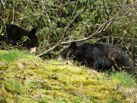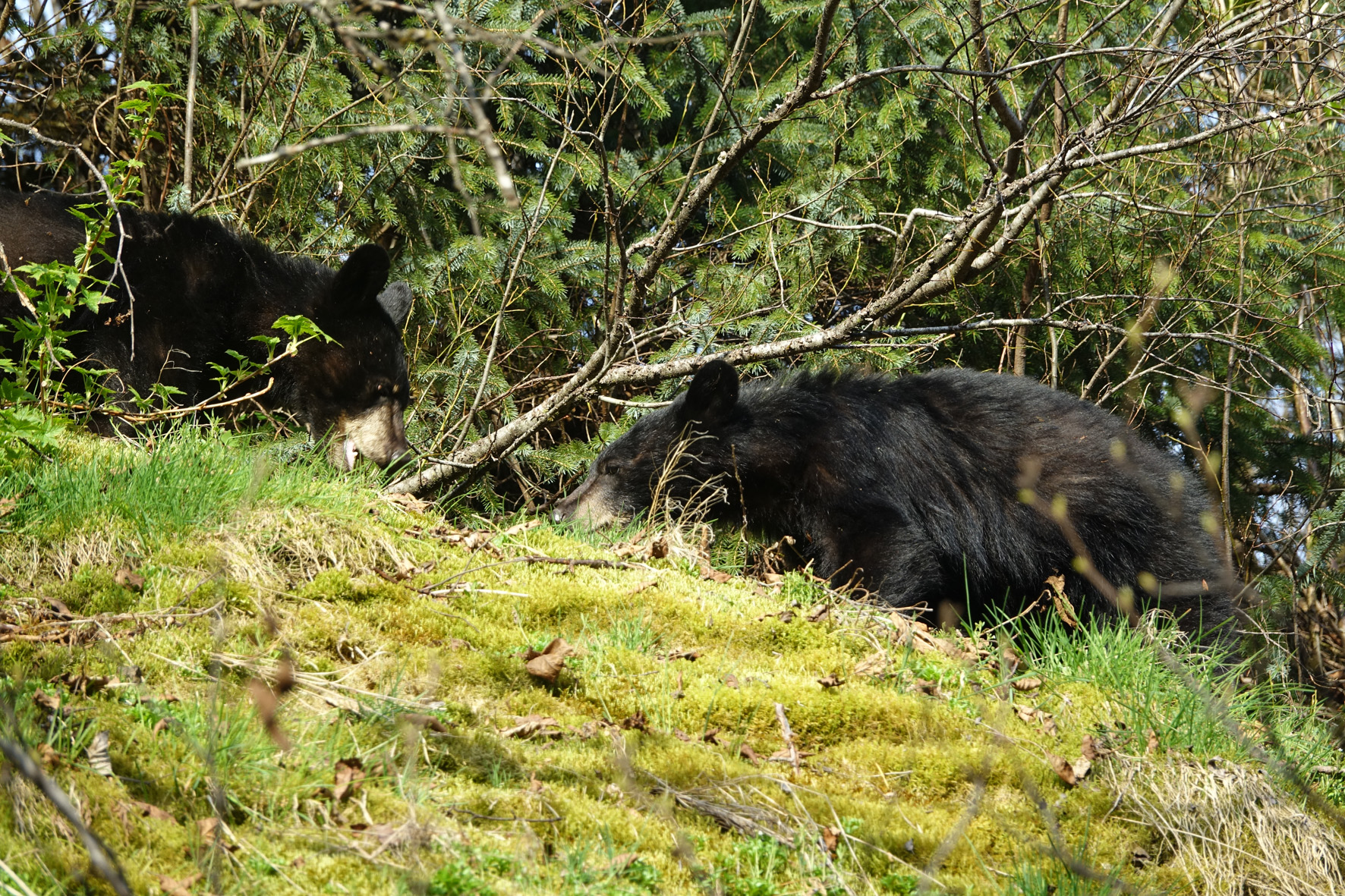 Also ich laufe zu diesem Wasserfalls, da kommt mir einer entgegengerannt und ruft „Bären“, rennt an mir vorbei. Keine Ahnung soll ich dem jetzt hinterher laufen? Da kommen mir ganz ruhig ein 2 Spaziergänger entgegen, also habe ich beschlossen, weiterzulaufen. Irgendwann raschelt es im Gebüsch. Da waren dann an einem Hang, so in grob 15 Metern Entfernung die 3 Bären, eine Mutter mit 2 Jungen. Die waren munter beim fressen, also habe ich meine Bilder gemacht. Ein unbeschreiblicher Moment. Da kommen 2 Fußgänger ums Eck, schauen blöd, später erfuhr ich warum. Er sagte zu ihr, schau, der Fotografiert Baumspitzen, erst dann haben sie gemerkt, was ich eigentlich fotografiere. Ein Japaner kam noch dazu. Die Bären haben sich nicht stören lassen. WAHNSINN!!!!