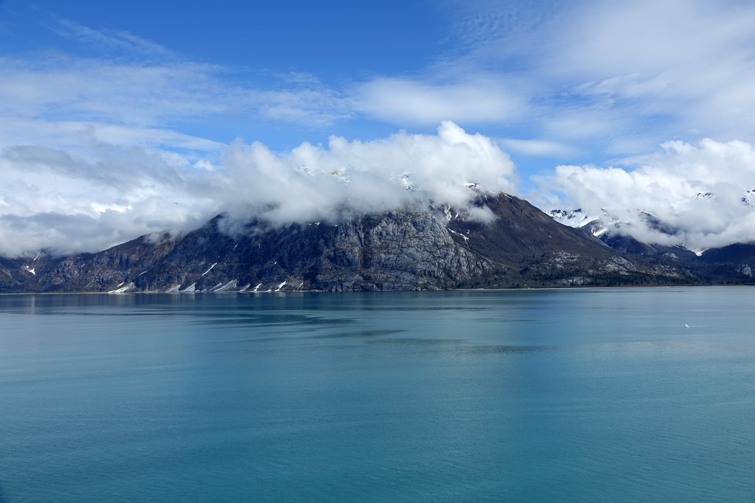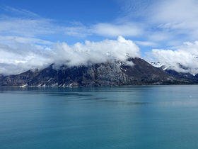 Glacier Bay. Unser Schiff „operiert“ in der Glacier Bay, hier dürfen nur 2 Schiffe pro Tag mit Sondergenehmigung und Park-Rangern an Bord hinfahren. Leichte Plastiksachen, die der Wind erfassen kann, waren an Deck verboten. Wir hatten mit dem Wetter etwas Pech, Nebel und leichter Regen, Mist. Naja, so ist der Norden. Der Regen hört dann auf und ab und zu kommt die Sonne doch durch. Das Eis hat schon tolle Formen. In der Glacier Bay gib es mehrere Gletscher, vor 2 Gletschern, machten wir jeweils Stopp und das Schiff drehte sich langsam, mehrfach um die eigene Achse. Wahrscheinlich, damit die Bequemen auf ihren Balkonen bleiben konnten, ja keinen Meter laufen.