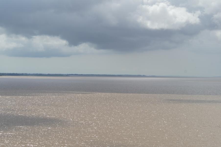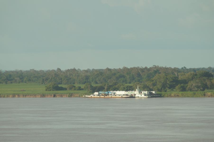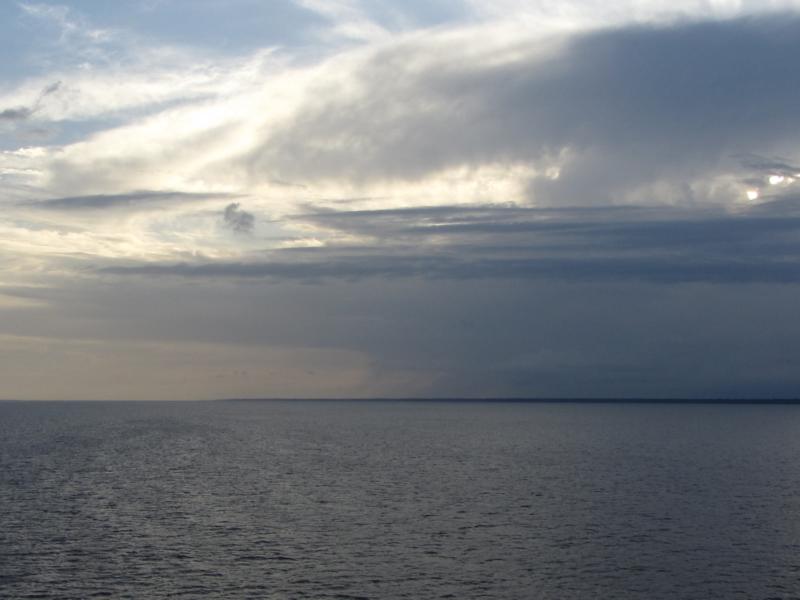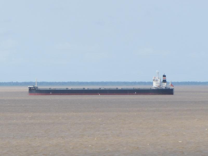 Erst fährt die Vita wieder ein gutes Stück hinaus aufs Meer, das erscheint mir doch recht komisch. Aber es klärt sich auf, sie umfährt eine große Sandbank im Flußdelta und biegt dann in den Amazonas ein, Santarém entgegen. Die Passage, die von den Schiffen benutzt werden, ist sehr schmal und deshalb der kleine Umweg. Unsere kleine Lady muss 1317 Kilometer zurücklegen, bis sie wieder irgendwo fest angebunden wird. Gemächlich ziehen ein paar Frachtschiffe vorüber, alles steht unter dem Motto "Langsamkeit"