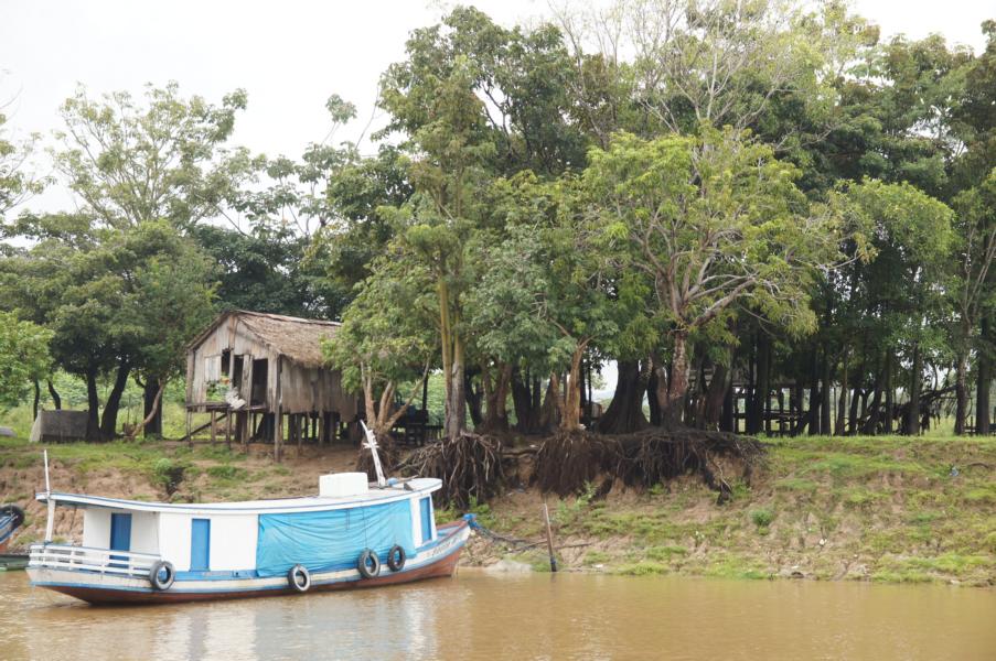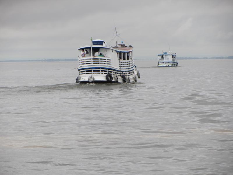 Rund 30 Minuten fahren wir auf dem Tapajos, bis wir an die Stelle kommen, wo er mit dem Amazonas zusammenfließt. Der Amazonas mit seiner Gesamtlänge von 6.992 Kilometern ist nach vor dem Nil der längste Strom der Welt und auch der Wasserreichste. Allein 10.000 Nebenflüsse speisen ihn. Also das ist schon beeindruckend.
