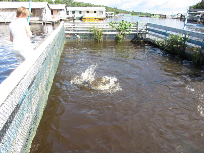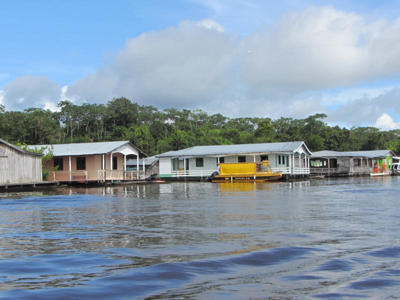 Es ist mehr wie ein kleiner Salat geworden und so treffen wir Erich gestärkt wieder. Der Plan für die nächsten Stunden: Es geht zum Treffen des Rio Negro mit dem Rio Solmes - auch "Encontro das Agus" genannt. Wir lassen die Stadt hinter uns. Unser Boot ist flott unterwegs und ab und zu bekommen wir auch ein paar Wasserspritzer ab.