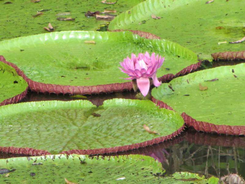 Vor uns eröffnet sich der Regenwald und wir sind am See angekommen. Wasservögel tummeln sich und rechts und links des Stegs schwimmen die kreisrunden Blätter der Seerosen. Diese Seerose gibt es nur hier im Amazonasgebiet und sie trägt den wunderschönen Namen "Viktoria Amazonia".