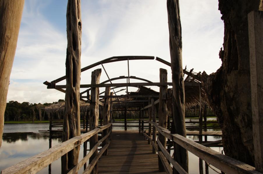 Vor uns eröffnet sich der Regenwald und wir sind am See angekommen. Wasservögel tummeln sich und rechts und links des Stegs schwimmen die kreisrunden Blätter der Seerosen. Diese Seerose gibt es nur hier im Amazonasgebiet und sie trägt den wunderschönen Namen "Viktoria Amazonia".