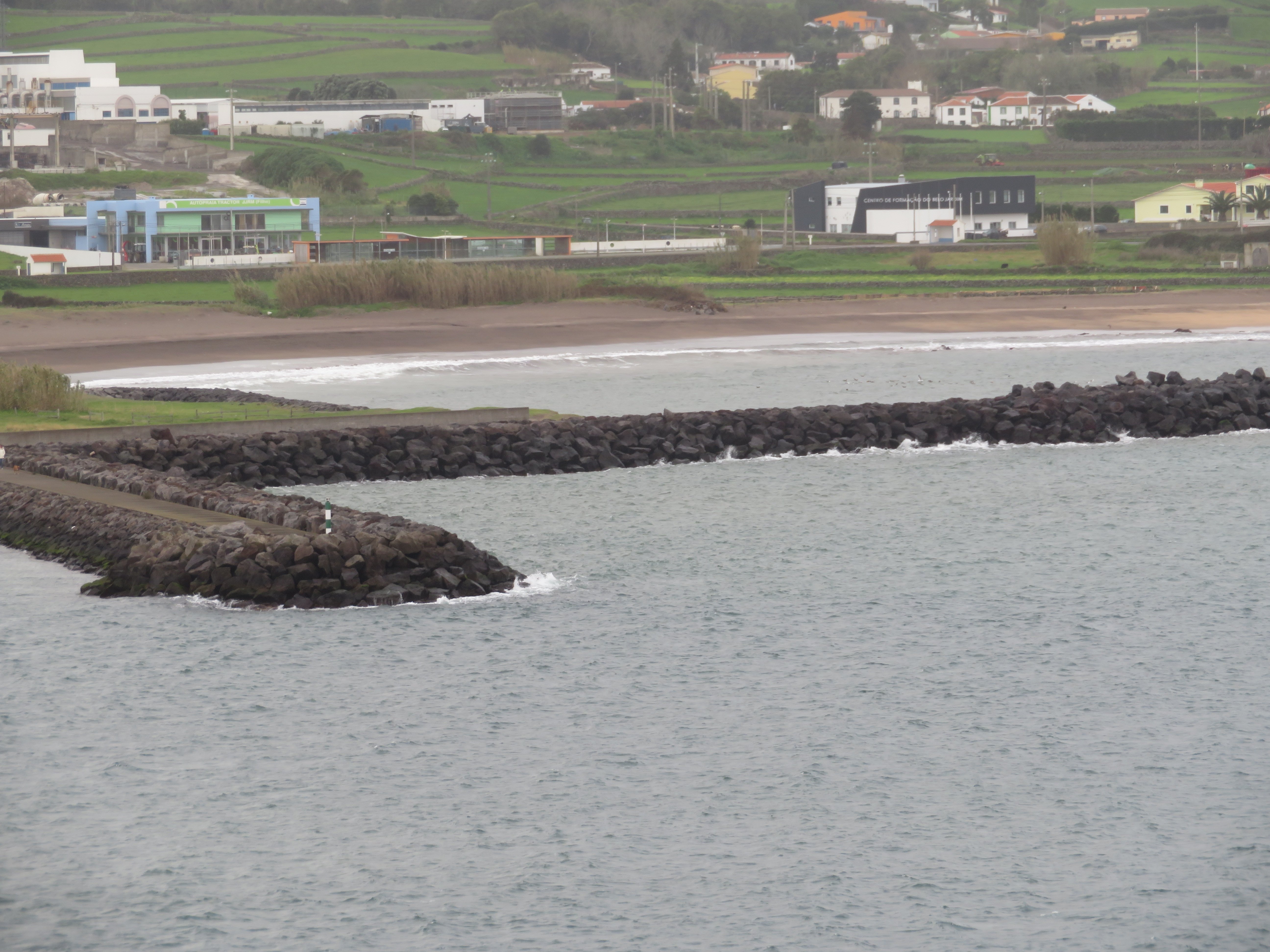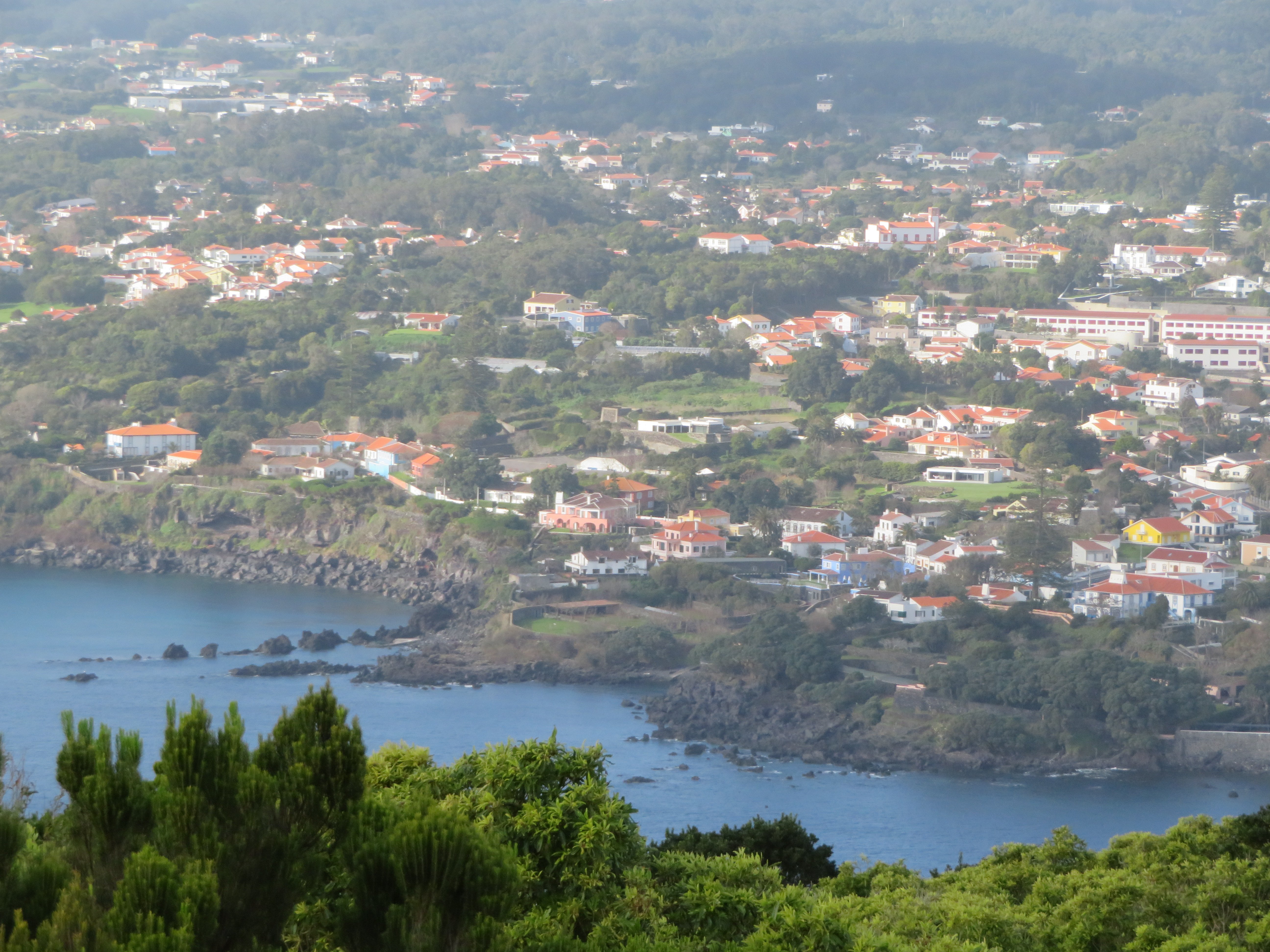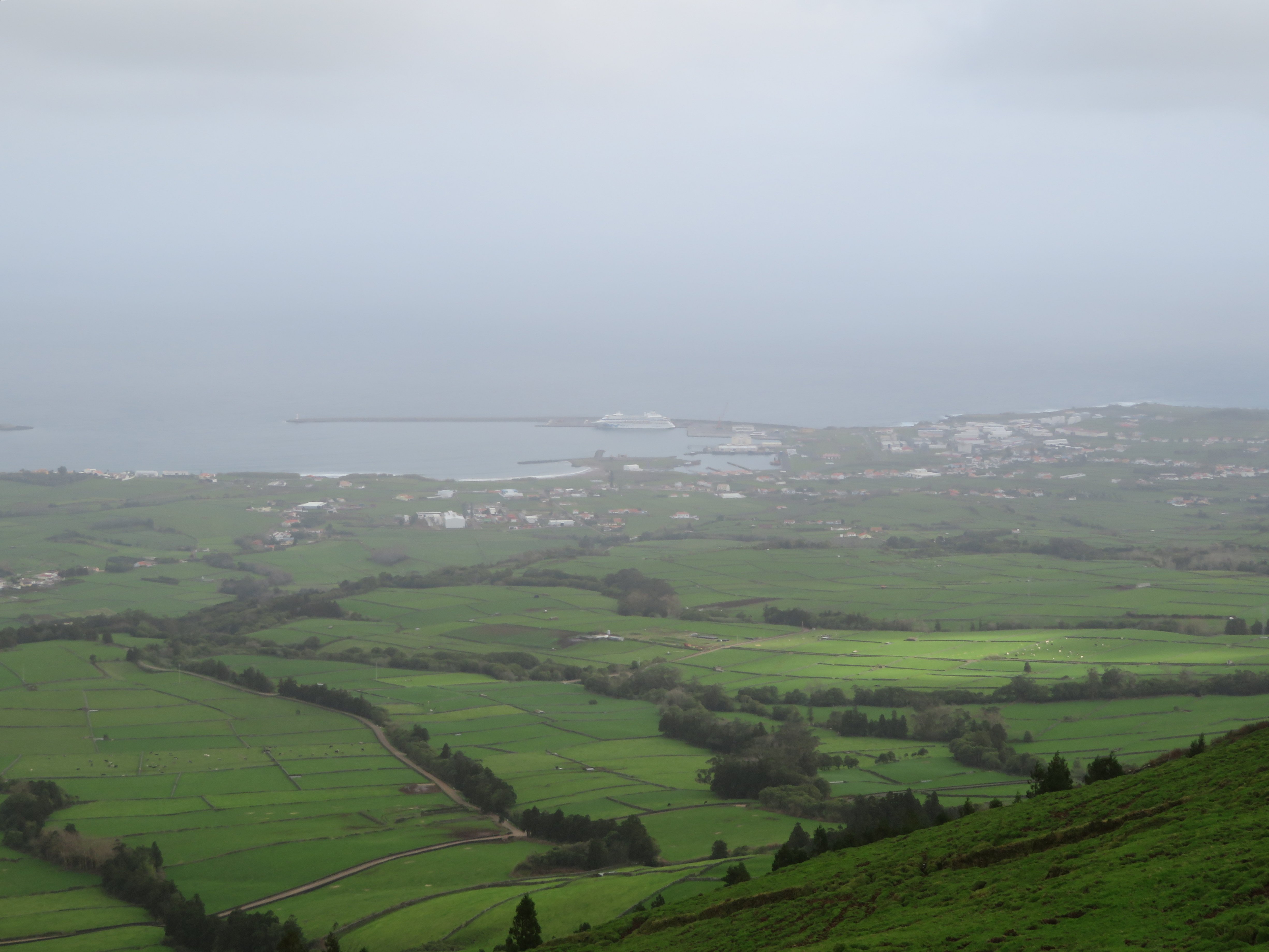 Von diesem Bergrücken, der eigentlich der Rest eines Kraterrandes ist, aus haben wir eine schöne Aussicht auf die Bucht von Praia da Vitória. Auch unsere Cara ist in der Ferne erkennbar.