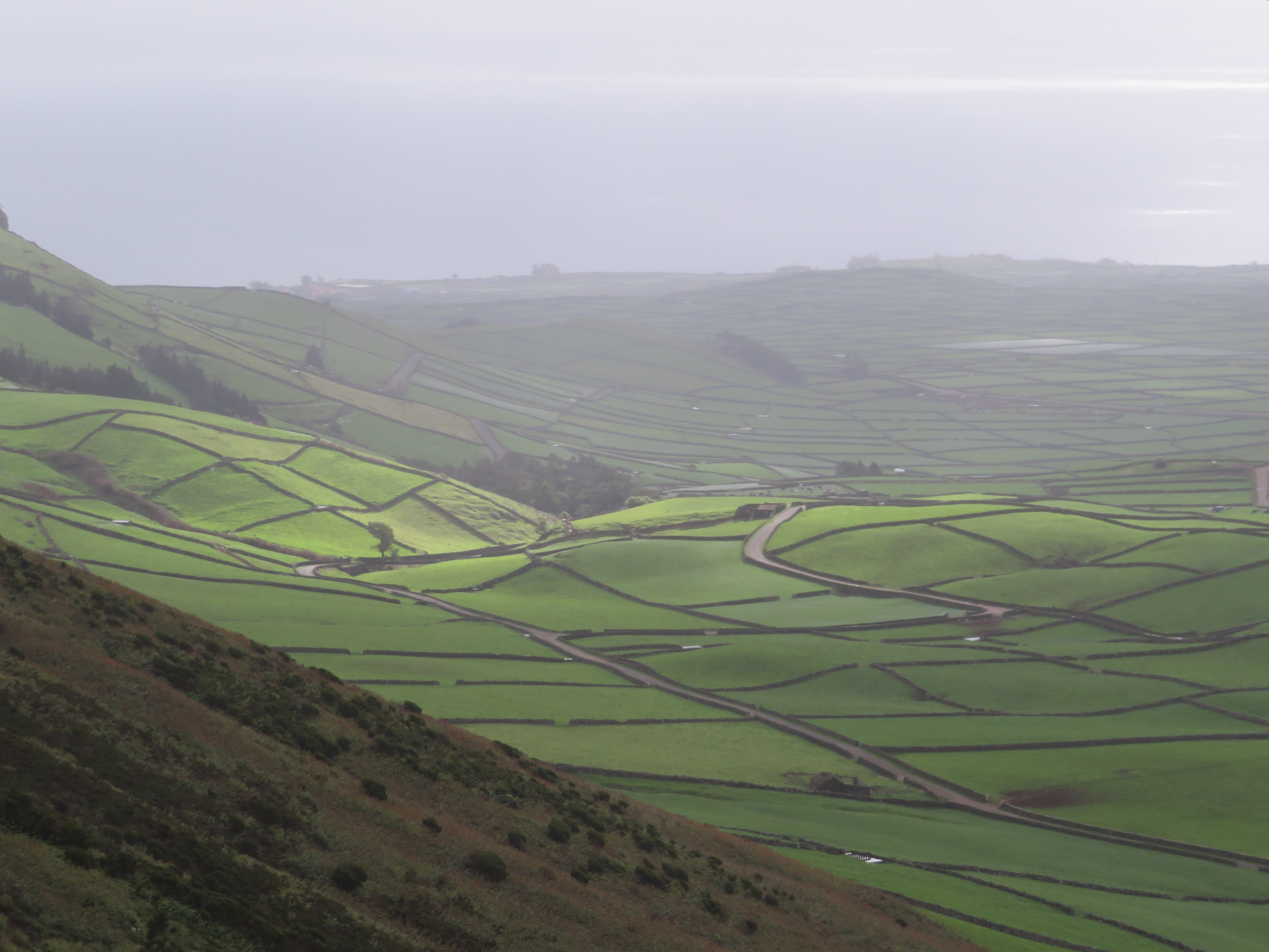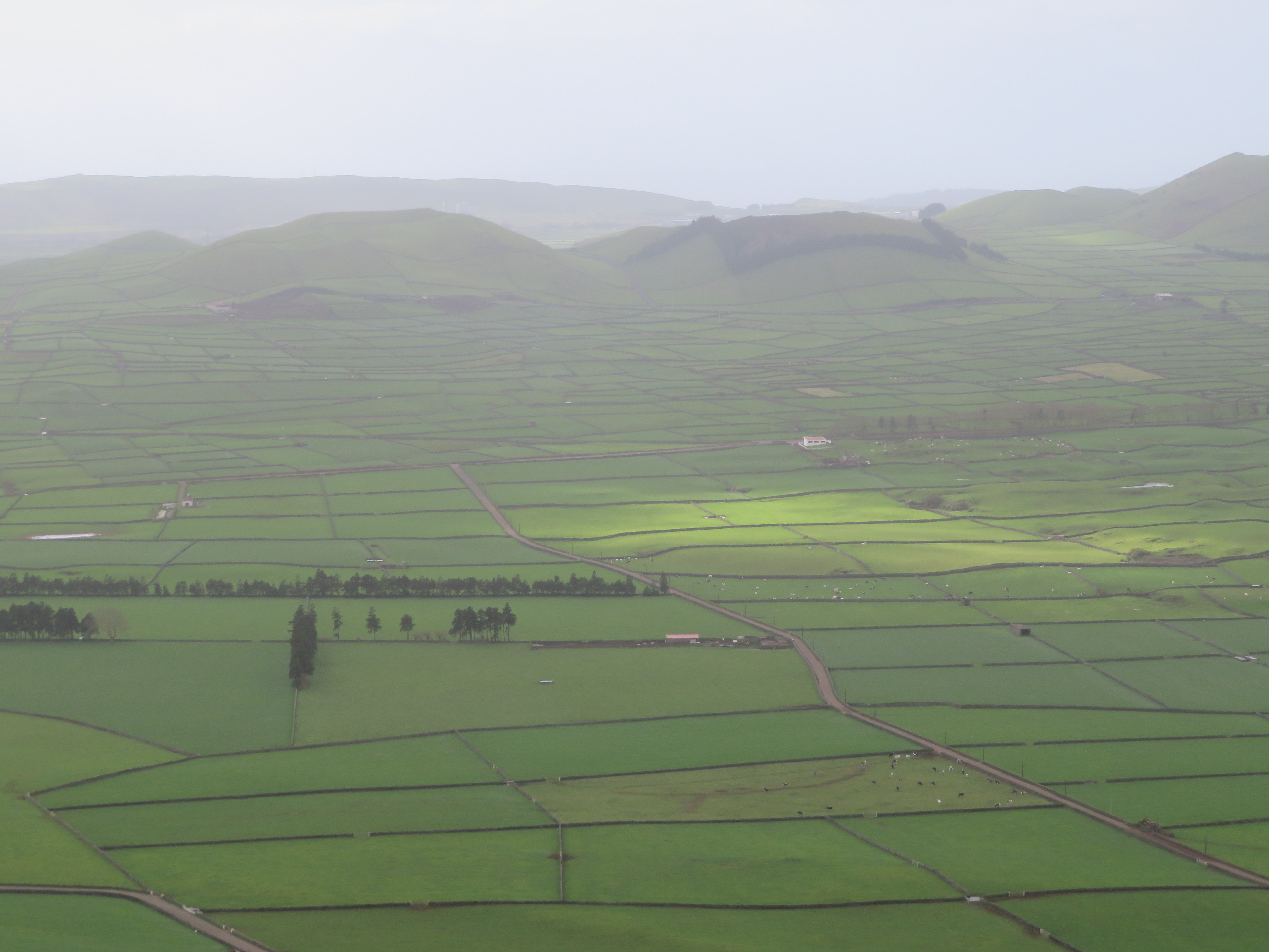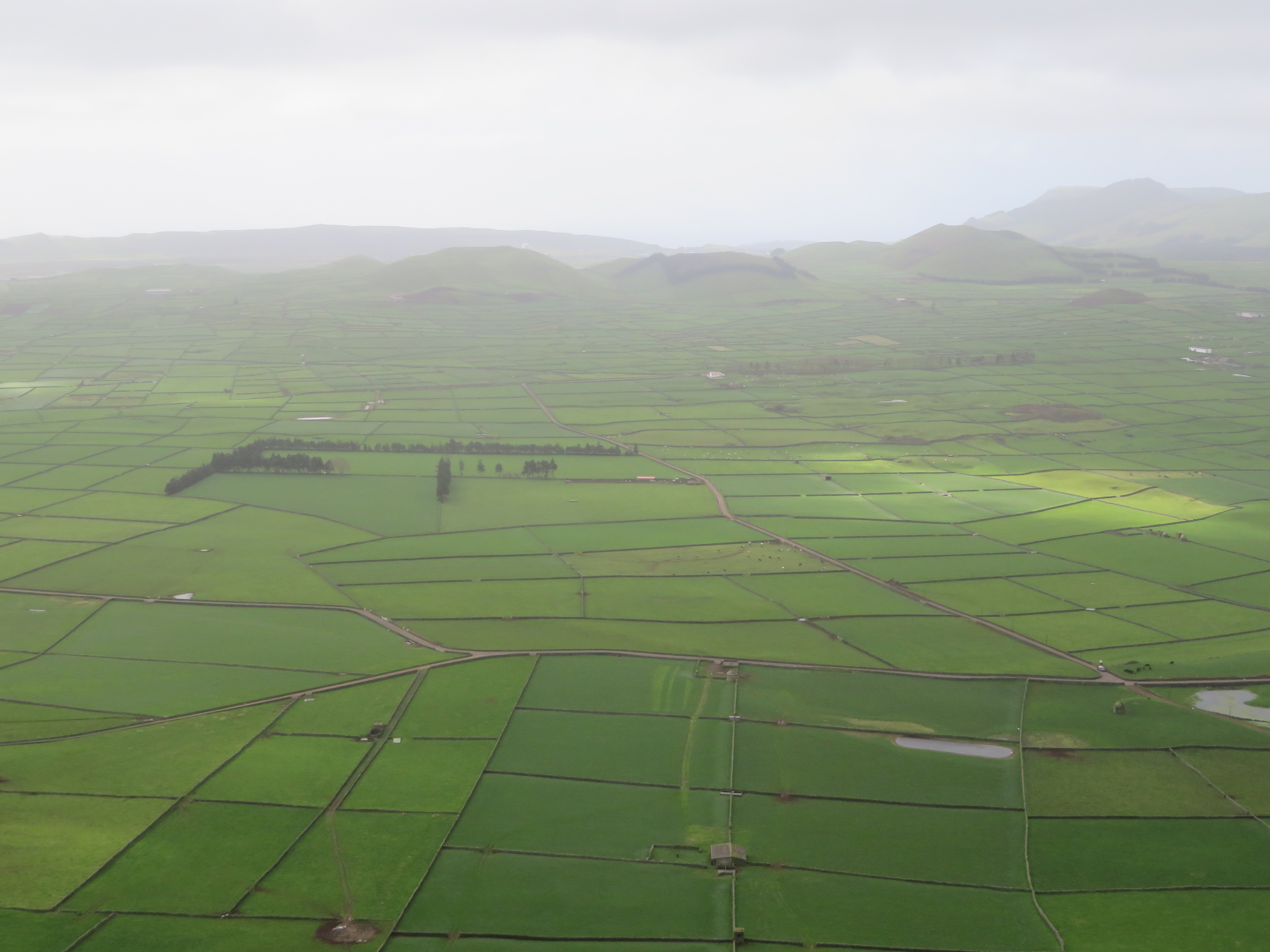 Am Himmel, fifty shades of grey, am Boden fifty shades of green. Es wirkt, als wären die einzelnen grünen Flicken mit vulkanischem Gestein zusammen genäht. Dieser Vulkan wirkt so gar nicht bedrohlich. Ganz im Gegenteil, er hat irgendwie etwas Beruhigendes. Trotzdem ist er mit 15 km Durchmesser der größte Krater der Azoren.