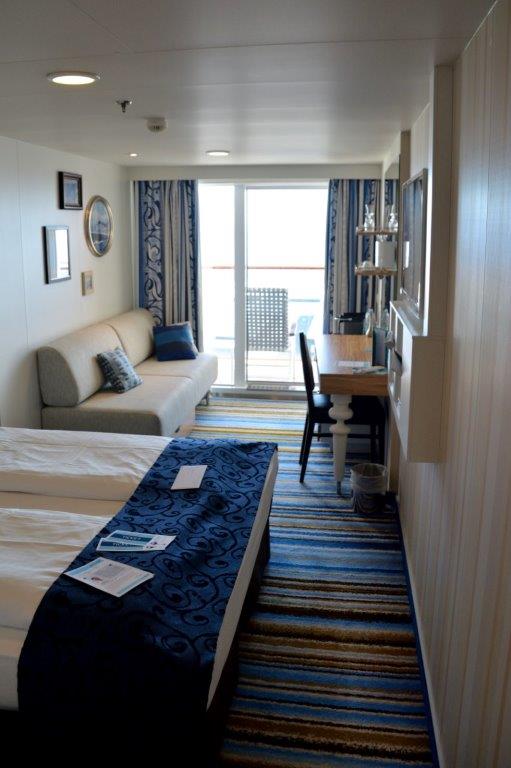 15 Uhr näherte sich und kurz vor diesem Zeitpunkt kam die Durchsage, dass die Kabinen bezugsfertig waren. Merkwürdig – kein Sturmlauf … Nach einigen Minuten wagten wir uns ins Treppenhaus. Nun gut – mit dem Aufzug hatten wir keine Chance. Es blieb der Weg per pedes. Kein Problem, denn es ging ja nach unten. Wir waren gespannt. Was erwartete uns? Eine Balkonkabine mit größeren „Freiflächen“ als bei den von uns bisher besuchten AIDAs.