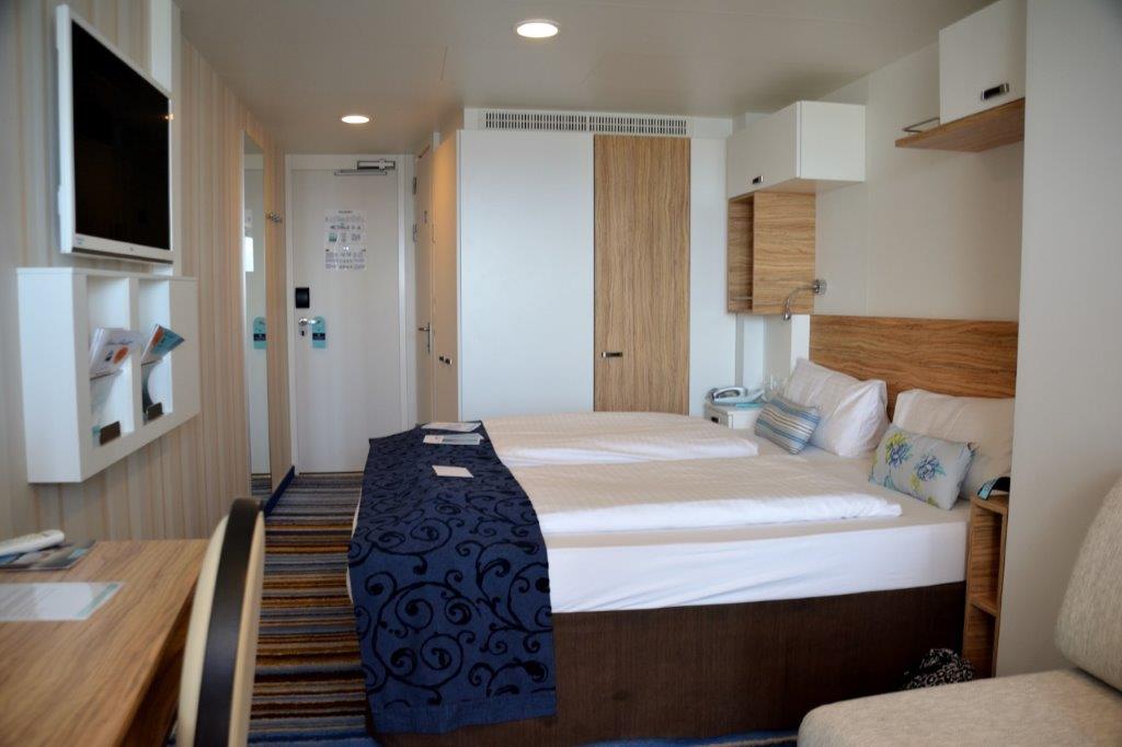 Hell, freundlich, modern. Punktgewinn für Mein Schiff 3. Allerdings gefielen uns die Aufteilung der Ablagemöglichkeiten bei AIDA besser, auch wenn wir keine Probleme hatten, unsere Klamotten unterzubringen. Das Badezimmer hatte in etwa die gleiche Größe wie bei AIDA. Die Duschabtrennung war optimal – beim Duschen hatte das Wasser keine Chance, für eine Überschwemmung außerhalb der Duschkabine zu sorgen. Das Waschbecken war sehr klein und in die Ecke gequetscht. Insgesamt gleichen sich AIDA und Mein Schiff in Punkto Kabinenbewertung aus.
