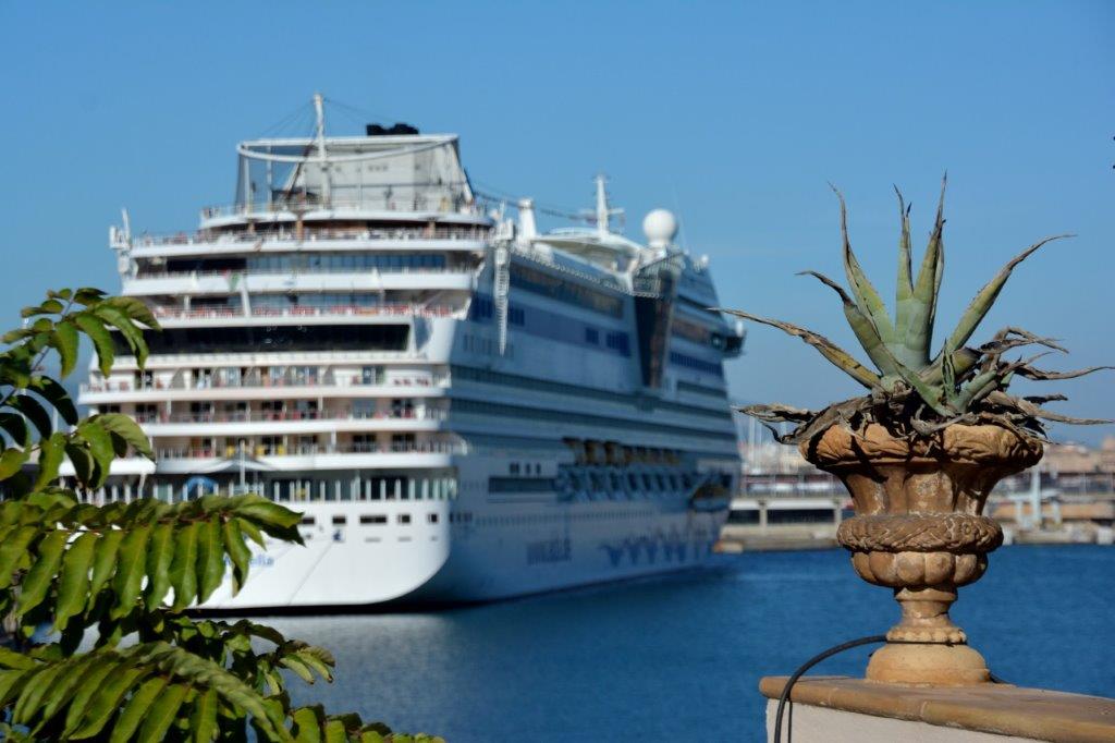 mit einem tollen Blick auf den Hafen, Yachthafen und das im Dunst liegende Tramuntana-Gebirge. Die fischigen Speisen waren einwandfrei. Nach dem Mittagessen benötigten wir Kaffee. Die Backstube lockte.