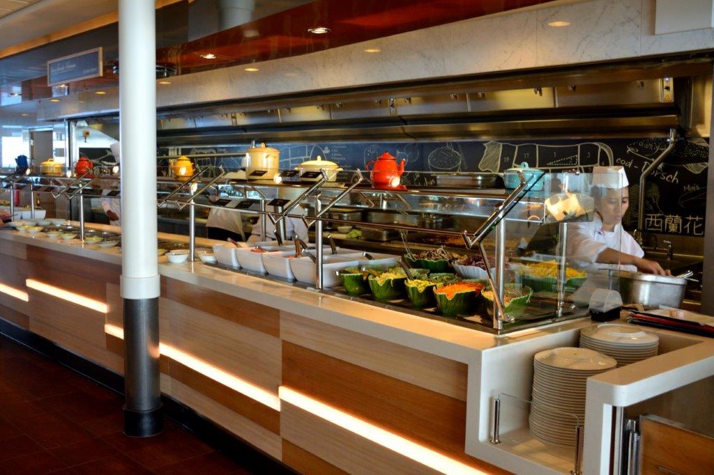 Früh – oder auch spät genug – das Abendessen wartete. An diesem Abend im Buffetrestaurant Anckelmannsplatz. Oh Wunder! Kein Herdenauflauf vor dem Eingang. Keine Sperre. Kein Skandieren: „Die Mauer muss weg!“ Ganz, ganz entspannt; also liegt auch hier Mein Schiff vorne (Wobei dieser Bewertungsbereich weniger von den verschiedensten Schiffen als vom Auftreten der Passagiere abhängt …). Aber auch später gab es keine Schlangen an den Buffetstationen und keine „Horden“, die freie Plätze suchten. Woran lag es? Dieses Restaurant hatte tagsüber durchgehend geöffnet mit dem Ergebnis: Entzerrung. Und aufgrund des Platzangebotes zog sich alles auseinander, was auch einen niedrigeren Geräuschpegel zur Folge hatte. Also Vorteil Mein Schiff. Nun aber los zum Buffet. Wir profitierten zunächst vom großen Wok-Bereich. Meeresfrüchte, Fisch, Garnelen, zwei oder drei Fleischsorten,