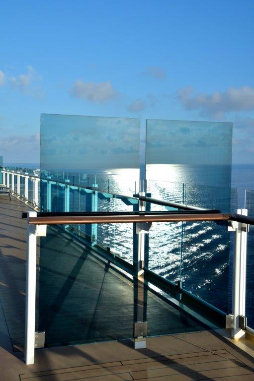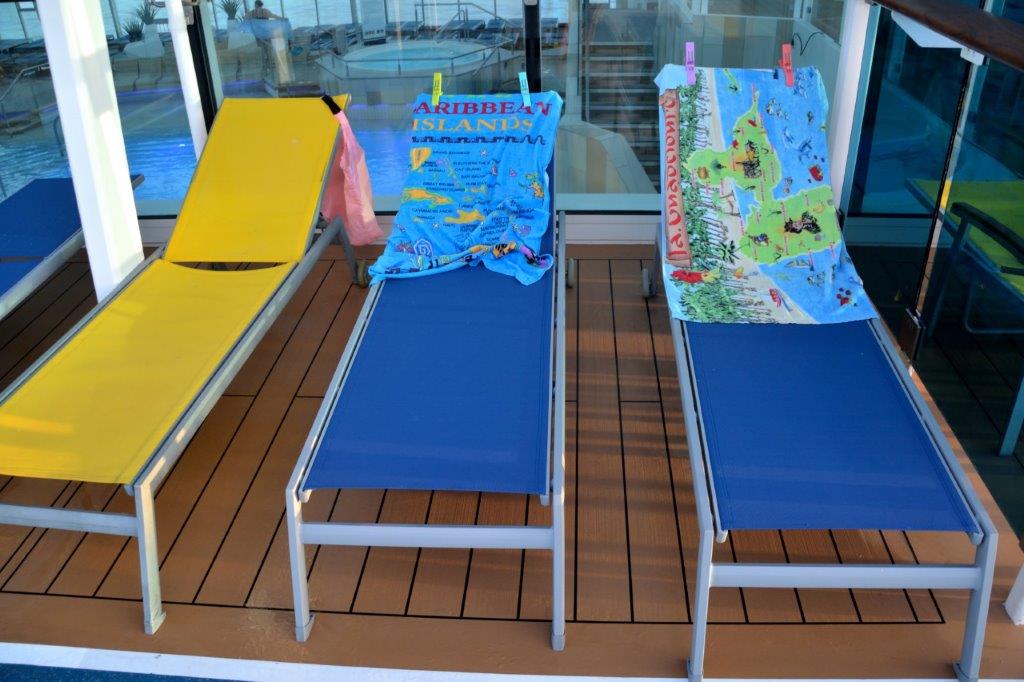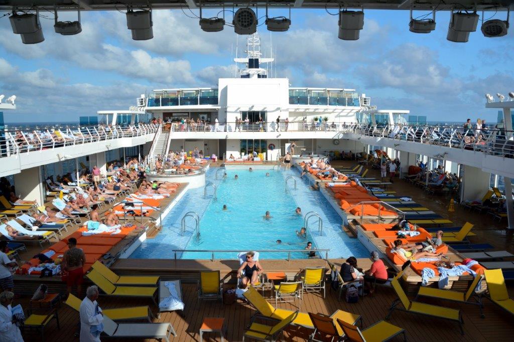 Die Kabinenfreigabe war für 15 Uhr angekündigt. Für alle. Übrigens konnten wir auf den AIDAs i.d.R. früher unsere Kabinen beziehen; also liegt in diesem Bereich AIDA vorne. Wir mussten für uns und unser Handgepäck einen Schattenplatz suchen und fanden ihn ohne Probleme am Pool; es gab viele freie Liegen – die meisten nicht „reserviert“, allerdings in der heißen Sonne. Die Poollandschaften überraschten uns – ein Innenpool, der größer war als die Außenpools auf den uns bekannten AIDAs und ein Außenpool mit 25 m – Bahnen.