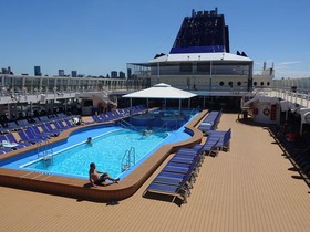 Bei einem wunderbaren Sonnenuntergang verließ die Norwegian Sun Buenos Aires. Auf dem weitläufigen Pooldeck heizte der Cruise Director die Stimmung an, auf meiner Kabine stand schon ein Früchtekorb und Sekt bereit, so kann der Urlaub beginnen.