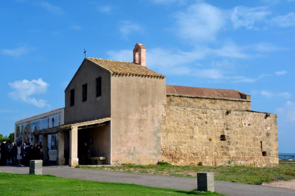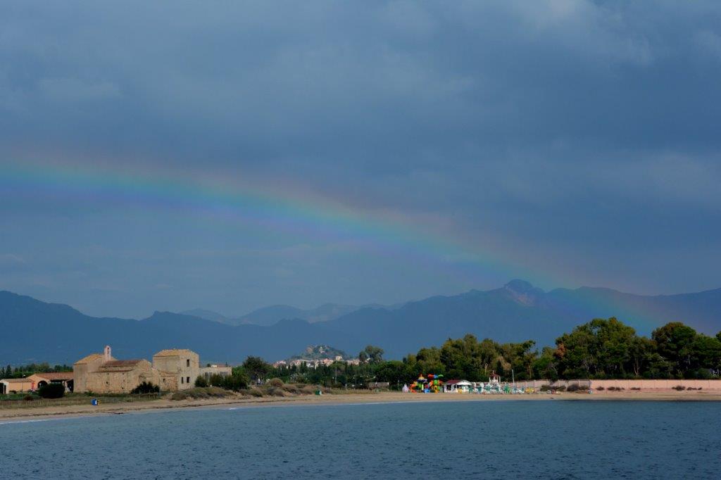 Auf einmal wurden wir schneller – ein kräftiger Regenguss zwang uns dazu. Wir stellten uns im Eingangsgebäude zur Ausgrabungsstätte unter und erfuhren dort, dass eine Besichtigung nur im Rahmen einer Führung möglich war. Aber erst nach Regenende … Ein Blick auf die Uhr – allein die Anfahrt mit den andauernden Tempobeschränkungen kostete eine nicht zuvor eingeplante Zeit und aus diesem Grunde verzichteten wir auf den Besuch von Nora. So plötzlich wie der Regen begann verschwand er wieder. Wir auch – vom Rande des Ausgrabungsgeländes wagten wir uns Richtung Chiesa di Sant'Efisio. Nicht schlecht, dieses Kirchlein unter dem Regenbogen.