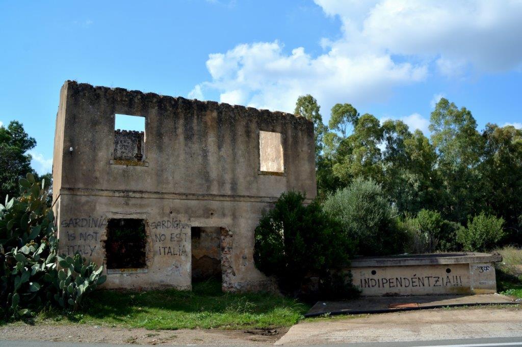 Ein ehemaliges Straßenwärterhaus, das seit zig Jahren nicht mehr benötigt wurde. Mit Botschaften von Separatisten: Unabhängigkeit – Sardinien ist nicht Italien. Ob die Separatisten Erfolg haben werden, steht in den Sternen … Und wir schauten von diesem Standort aus nach oben.