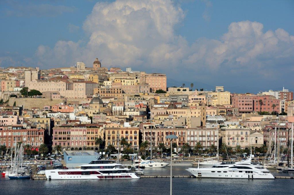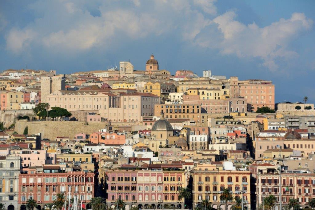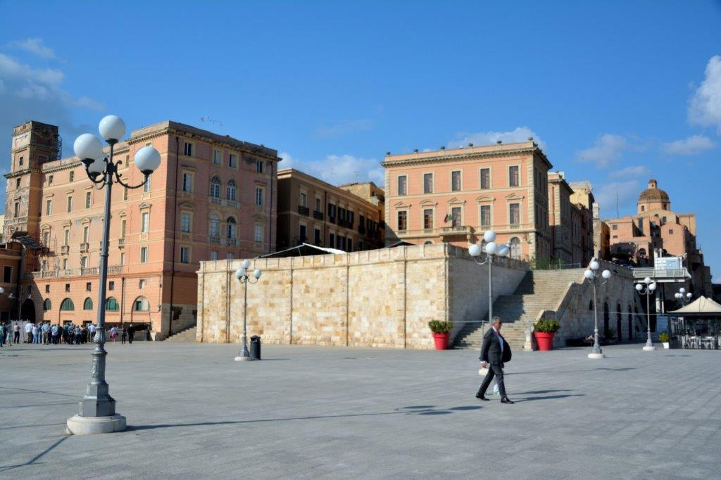 Am 1215 erstmals urkundlich erwähnten Castillo di Acquafredda hatte der Zahn der Zeit genagt. Nur noch Reste blieben übrig – aber von unten sahen sie schon beeindruckend aus. Gerne hätten wir die Ruinen auf dem 256 m hohen Berg besucht … die u.E. knappe Zeit ließ es leider nicht zu. Also weiter – zurück nach Cagliari. Gegen 15 Uhr stellten wir unseren Panda vor der Autovermietung ab. Es war aber nichts mit der Rückgabe, denn das Büro wurde erst um 16 Uhr geöffnet. Die Zeit nutzten wir, um die Altstadt zu besuchen. Vorbei am imposanten Bahnhof von Cagliari und dem monumentalen Rathaus