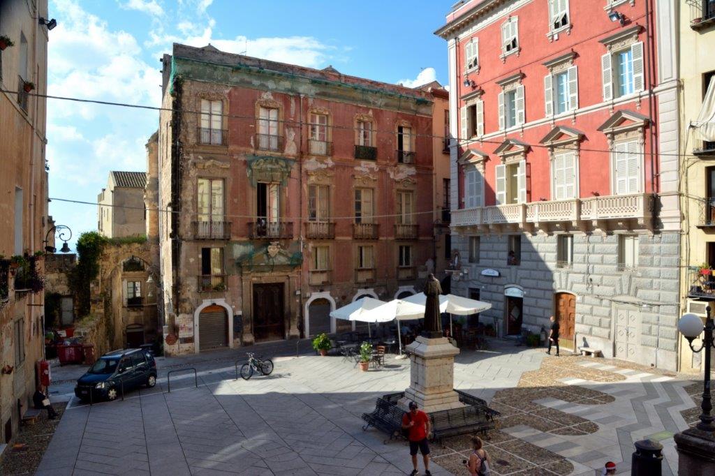 Am Rande des blitzsauberen Piazza Carlo Alberto mit der Statue des Franz von Assisi ein einstmals repräsentativer Palazzo. Einstmals … aber – so, wie es aussah – noch immer bewohnt. Nun aber bergab – durch eine äußerst schmale Gasse. Gut, dass es keinen Gegenverkehr gab … Gegenverkehr? Richtig – wir wurden von einem langsam fahrenden Auto passiert … Eins erkannten wir: Auf Sardinien war am Samstag Waschtag! Und noch eins: Es gab nicht wenige ehemals ansehnliche Bauten, die nicht nur Farbe benötigten …