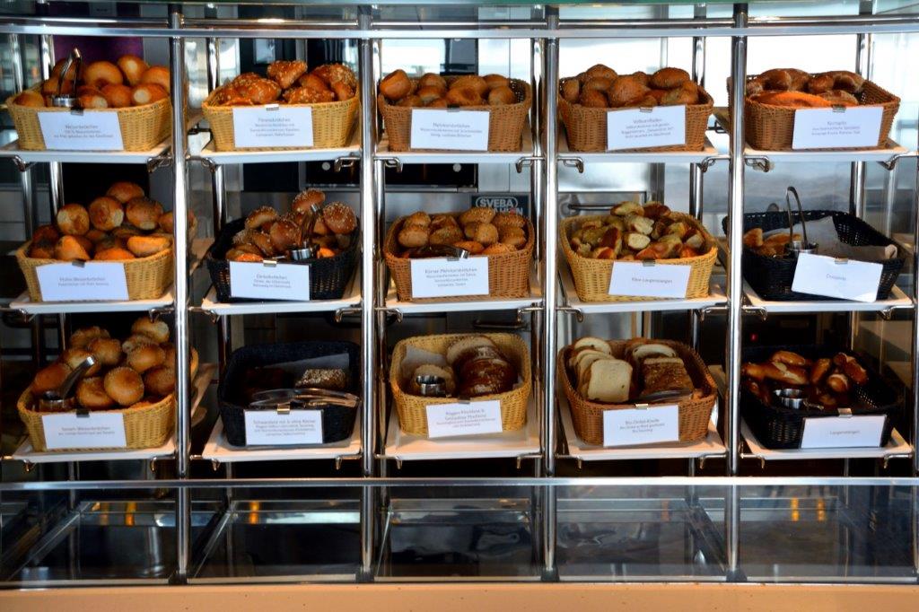 in der wir die Qual der Wahl hatten. Brötchen unterschiedlicher Art, Croissants, verschiedene Brotsorten. Alles herrlich frisch gebacken duftend. Neben diesem Regal noch ein sich nach unseren Beobachtungen schnell leerender Brotkorb mit dem Artisan-Brot, das nach dem ersten Kennenlernen unser Favorit werden sollte. Knackige Kruste, geschmackvolles und lockeres Inneres. Solltet Ihr zu Hause Sehnsucht nach dieser Brotsorte bekommen, müsst Ihr die Ärmel hochkrempeln und beim Singen von „In der Artisan-Bäckerei“ kneten und kneten und kneten: