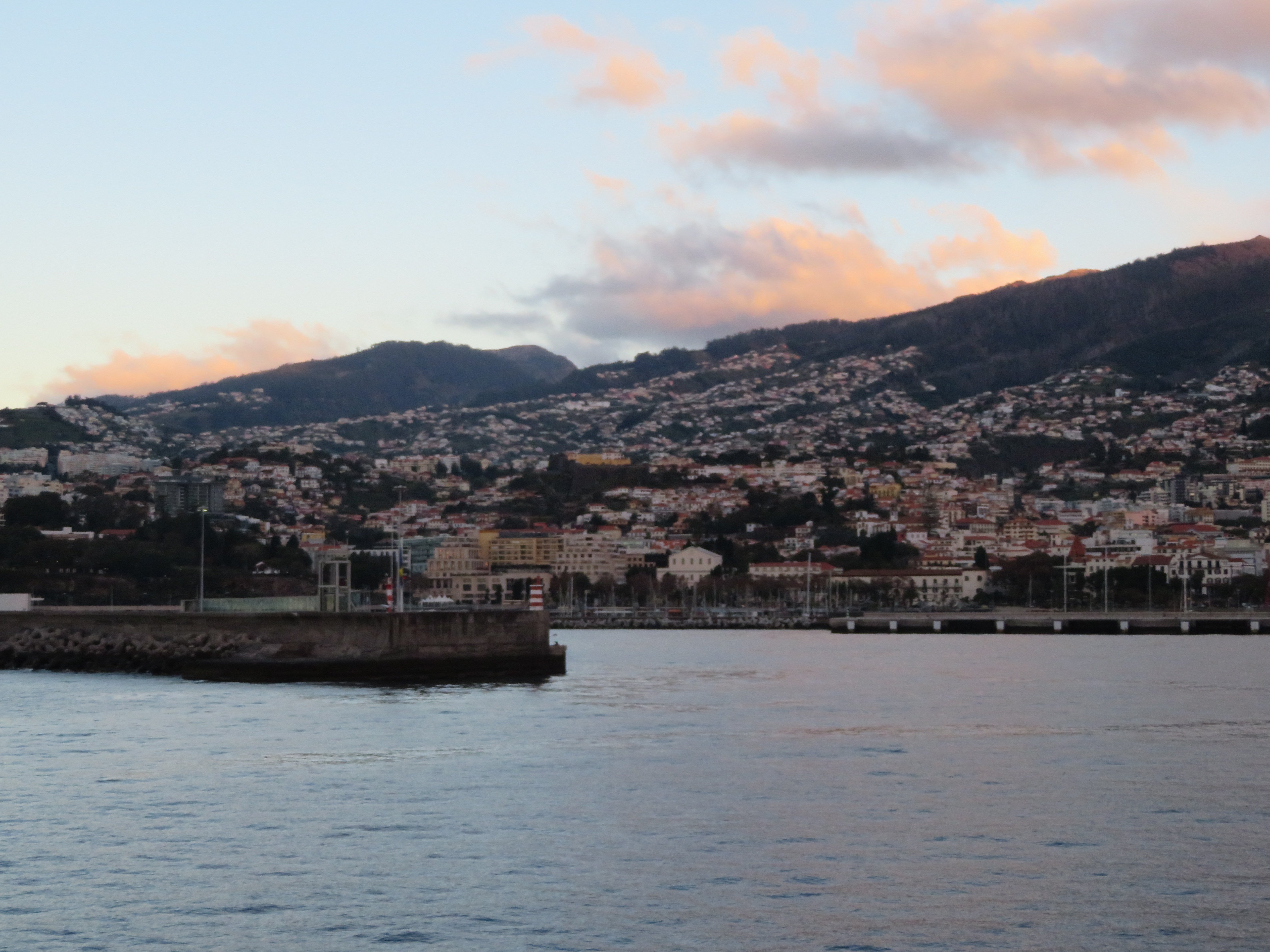 Inzwischen ist die Sonne über dem Meer aufgegangen und strahlt Funchal an. Nur die Gipfel der Berge sind in Wolken gehüllt.