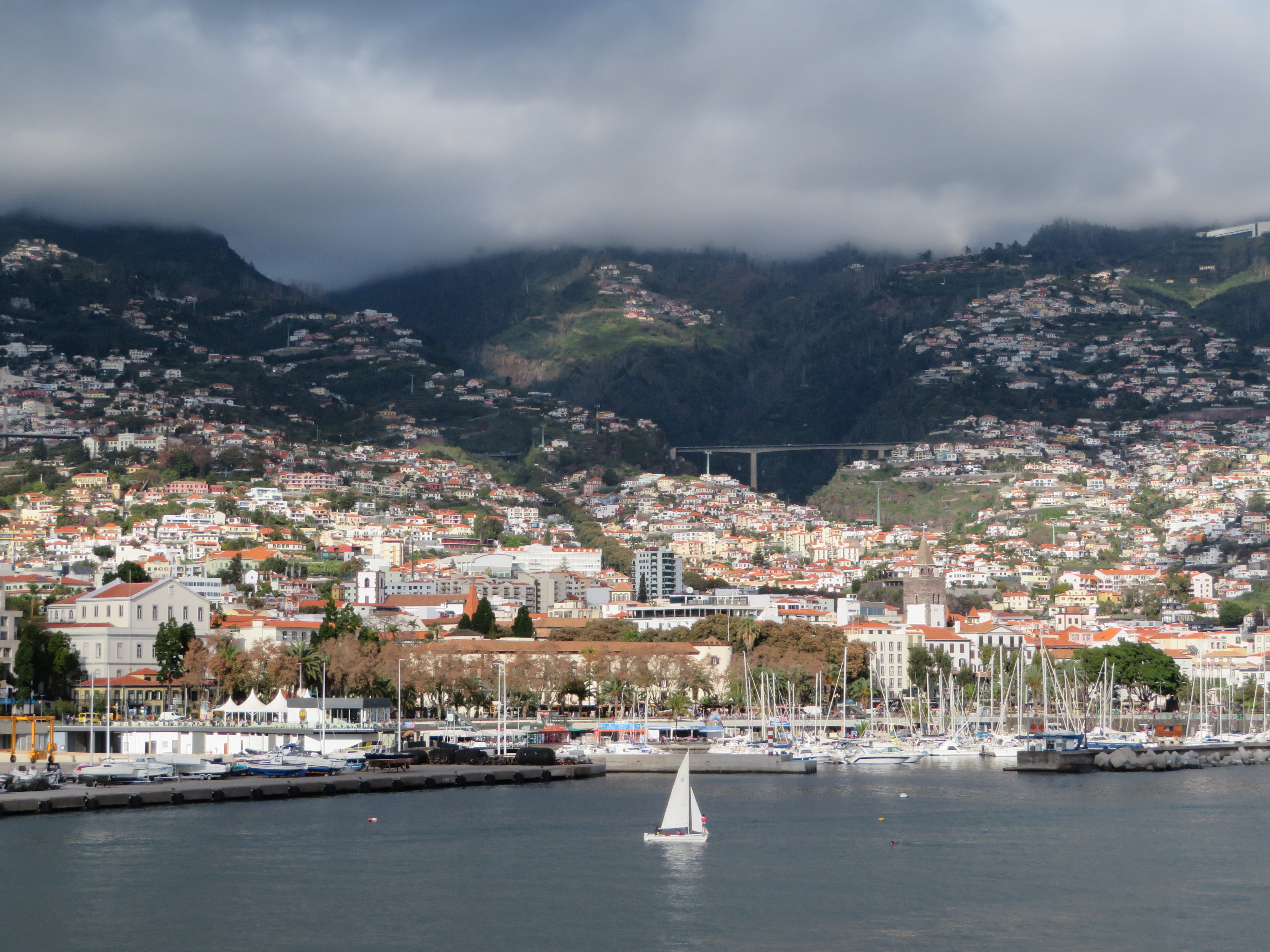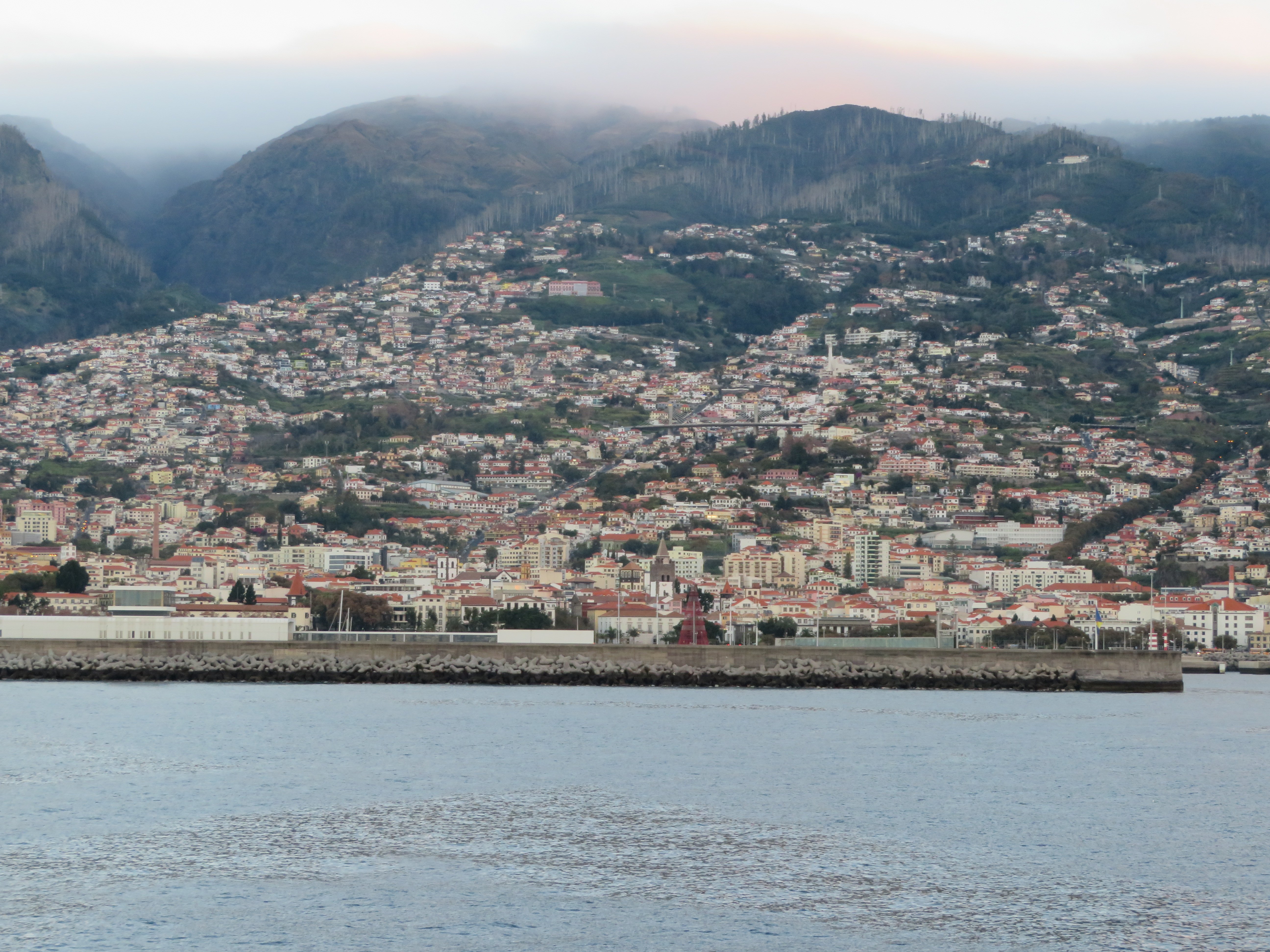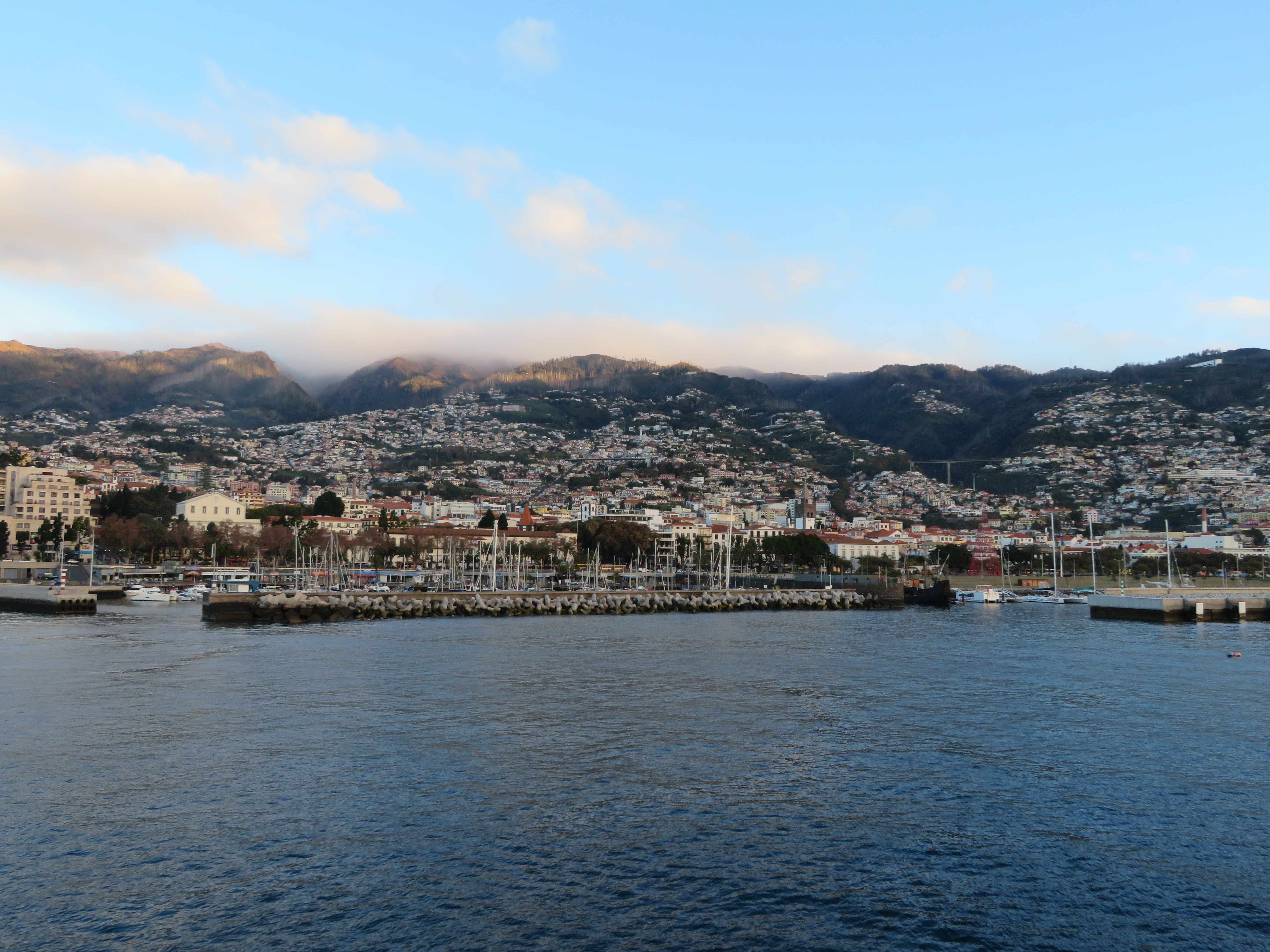 Inzwischen ist die Sonne über dem Meer aufgegangen und strahlt Funchal an. Nur die Gipfel der Berge sind in Wolken gehüllt.
