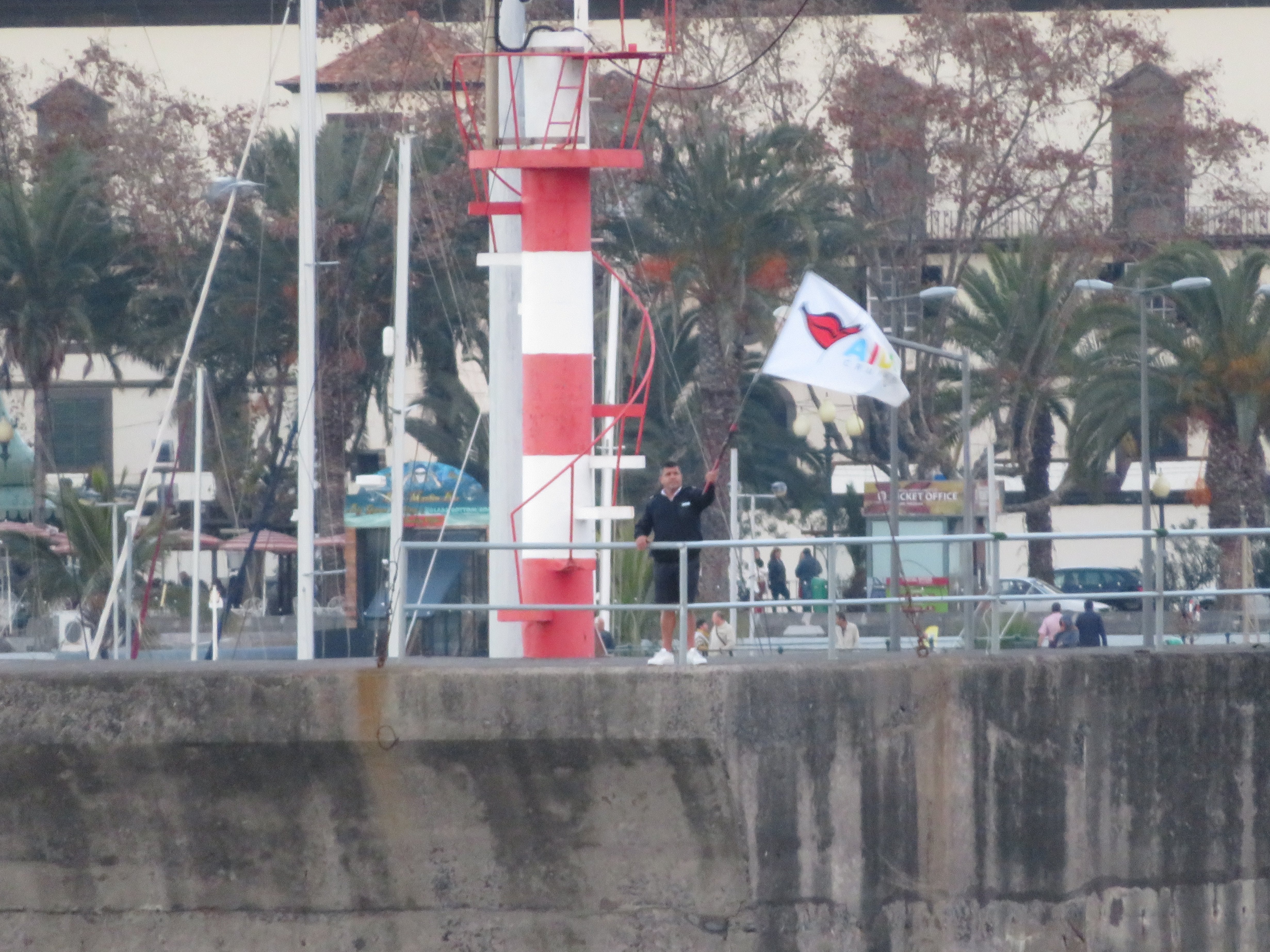Ich spreche von Inacio, auch ein Einheimischer und wahrscheinlich der größte Fan von Aida überhaupt. Er steht bereits am Ende der Mole und schwenkt die AIDA-Fahne.