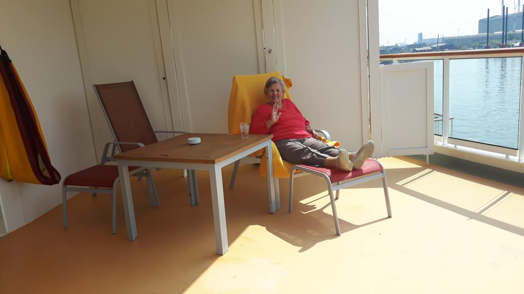 Als Abschlussgeschenk an uns selbst bummeln wir noch durch die kleinen Läden im Hafen. Ich habe gerade keine Lust auf Klamotten und so gehe ich aufs Schiff zurück. Mutti hat es sich draußen auf dem Balkon gemütlich gemacht, das Obst gegessen und fragt gleich nach den Fotos. Ich setze mich zu ihr und erzähle, was wir gemacht haben. „Ach, die Königin war ja zu Hause, die Fahne weht auf dem Dach. Ist ja Sonntag, vielleicht ist bei denen Familientag“ ihr Kommentar zu den Bildern vom Schloss. „Und, habt ihr die Eisdiele wieder gefunden?“ Ich nicke und erzähle vom Marathon in der Stadt. Nach einer halben Stunden trudeln unsere beiden Shoppingdamen ein. Jede hat eine Tüte und sofort werden neu erworbenen Kleidungsstücke vorgeführt. „Mensch, da habt ihr Glück mit den Sachen. Toll seht ihr aus“, Mutti ist voll des Lobes.