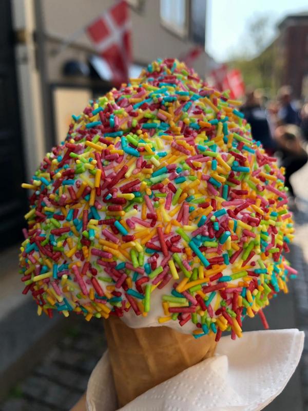 Unser Spaziergang führt uns entlang schöner Häuser mit auffallend reich verzierten Fassaden, bis wir endlich am Nyhaven ankommen. Überall stehen kleine Tische und gemütliche Stühle vor den Restaurants. Auf den Tellern sehe ich im vorbeigehen kalte Platten mit Variationen von Fisch und auch das berühmte Smorbrod, das reichlich belegt ist. Man trinkt Weißwein, Bier und auch Kaffee und dann erblicken wir schon von weitem das Schild der Eisdiele. Auch Waffeln gibt es hier und der Duft ist betörend gut. Die Leute stehen bis draußen auf den Bürgersteig. Meine Tochter und Schwester gönnen sich ein Softeis mit bunten Streuseln – ich schaue mir derweil den Hafen an.
