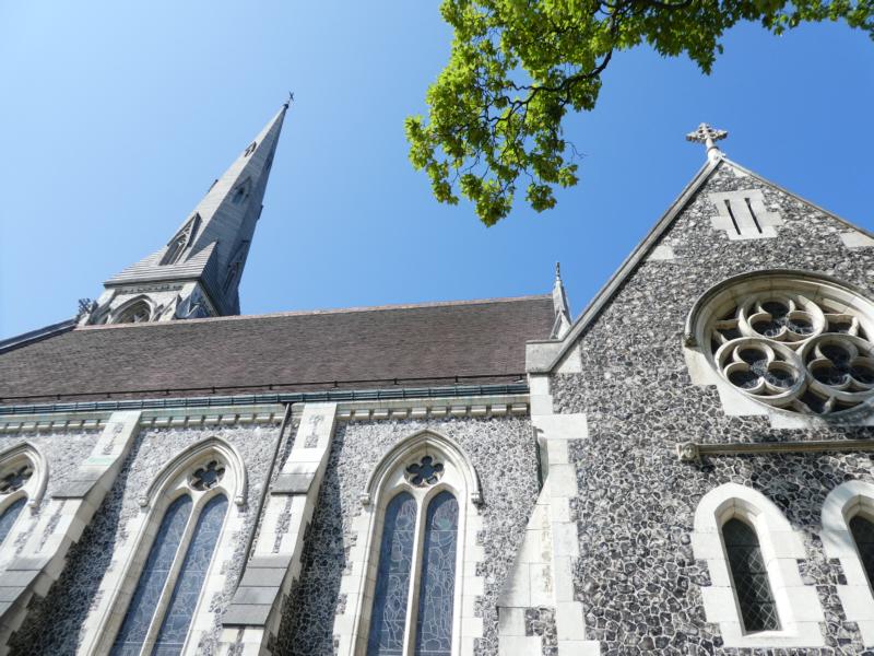 steinernes Kunstobjekt. Als ich durch mein Objektiv zum Kirchturm der St. Alban's Church hochschaue, sehe ich, es gibt nicht eine einzige Wolke am