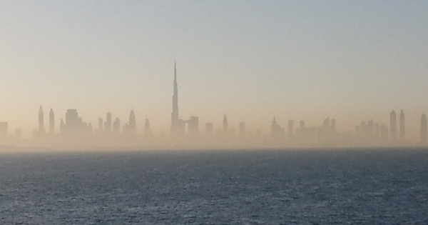 Die Einfahrt nach Dubai im morgendlichen Nebel ist sehenswert. Langsam erscheint die Skyline mir Burj Al Arab und Burj Kalifa. Besonders eindrucksvoll, wenn man dabei im Bademantel auf dem Balkon stehen kann. Vorausgesetzt man hatte Glück beim "Kabinenroulette vario" und wie wir eine Balkonkabine steuerbord erwischt.