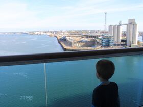 Danach machen wir noch einen Spaziergang auf dem Skywalk und Tom ist wieder ganz fasziniert vom Hafen und dem bunten Treiben tief unter uns.