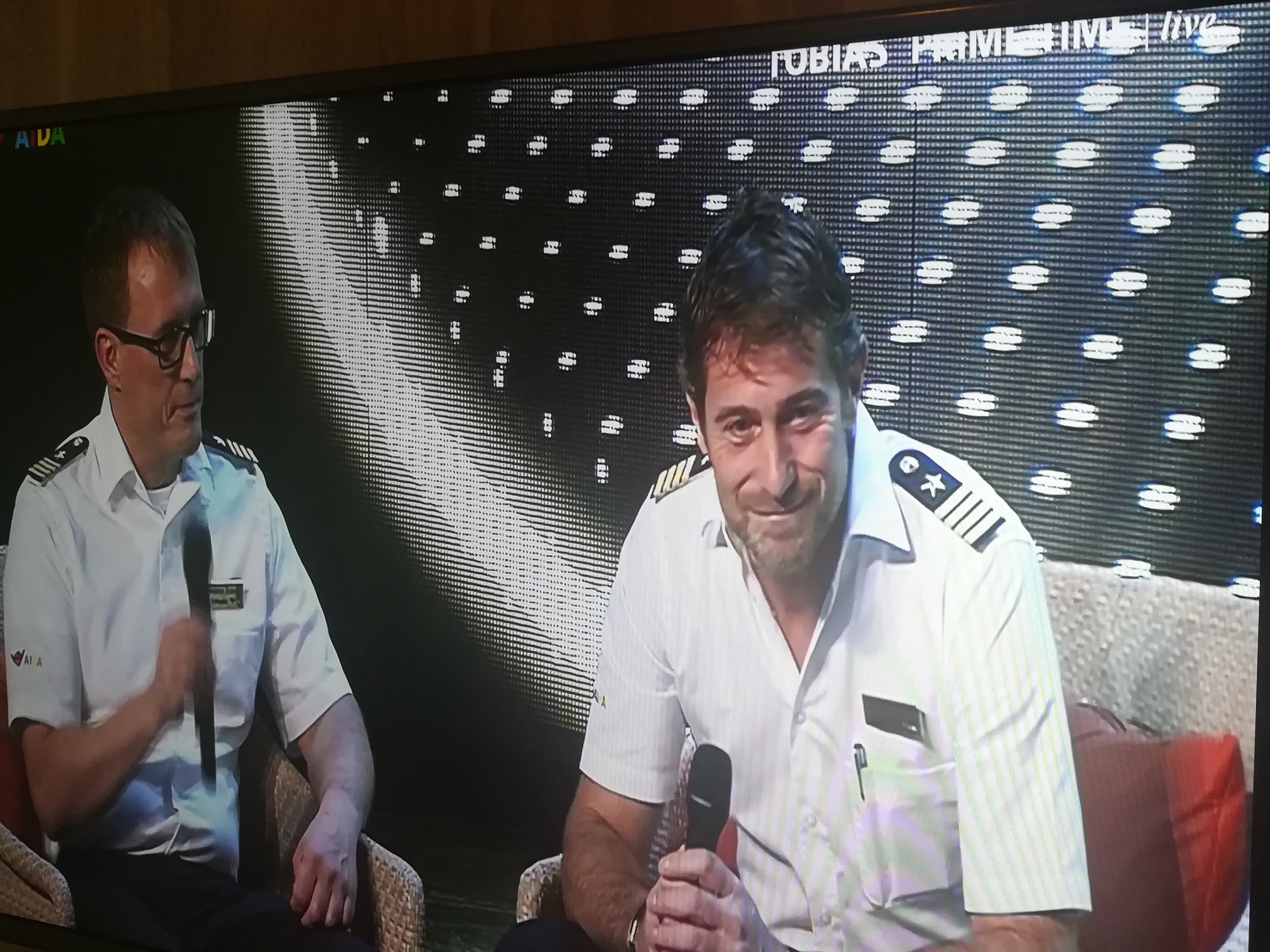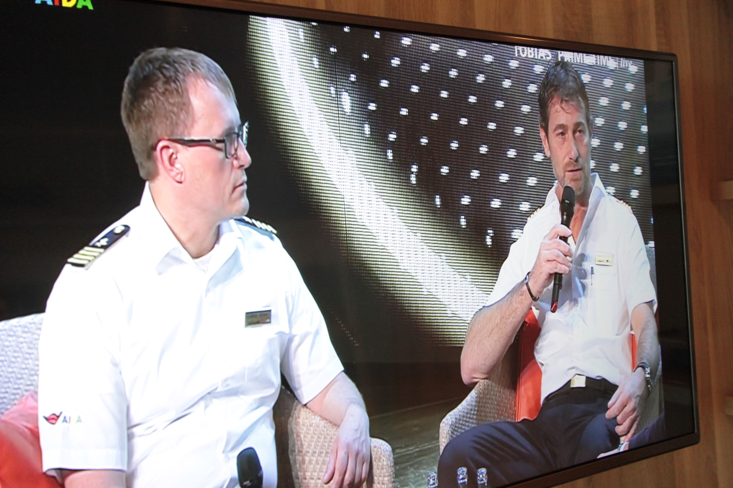 Um zwanzig vor acht sind wir wieder auf der Kabine und schauen uns im Bord TV „Tobias Prime Time“ mit unserem Kapitän Paolo Benini an.