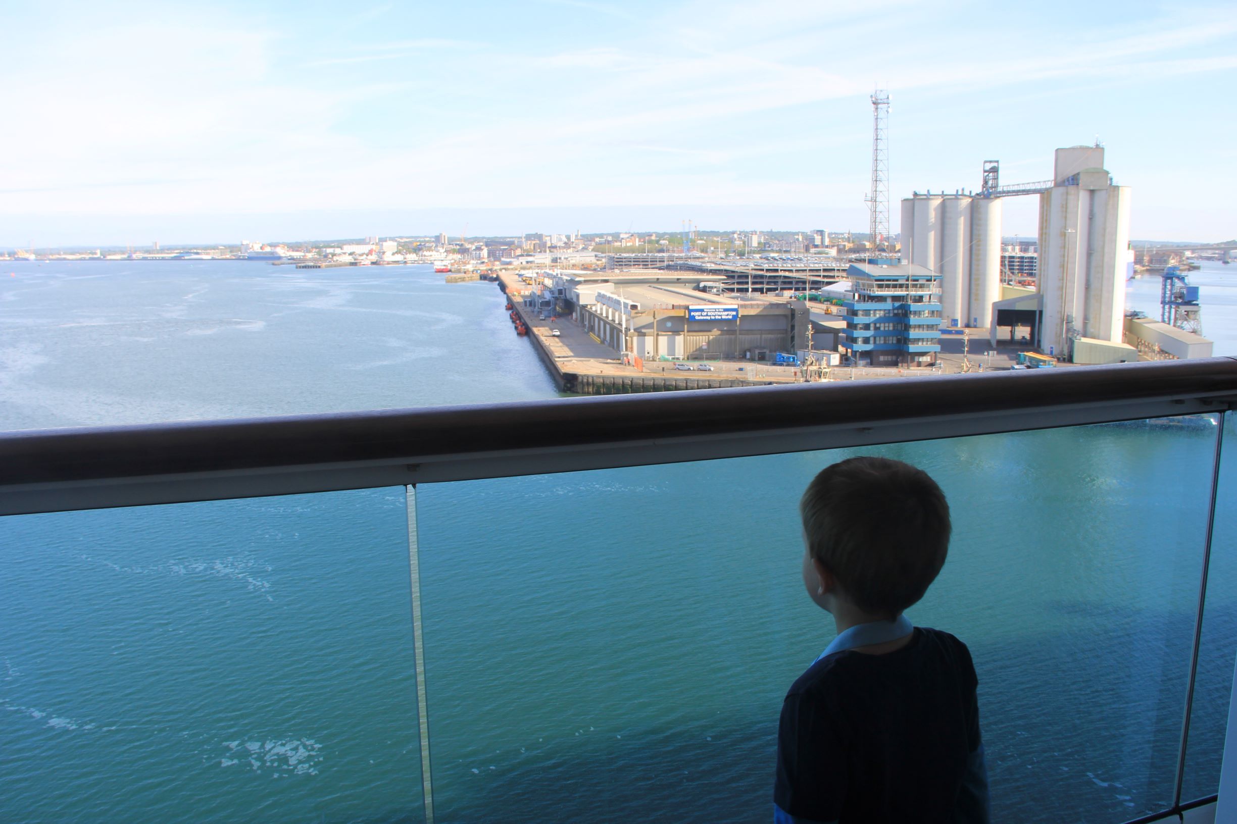 Nach dem Frühstück schauen Tom und ich von der Veranda dabei zu, wie Kapitän Benini seine Perla einwandfrei in Southampton anlegt. Tom ist schwer begeistert und kaum vom Balkon wegzubewegen.