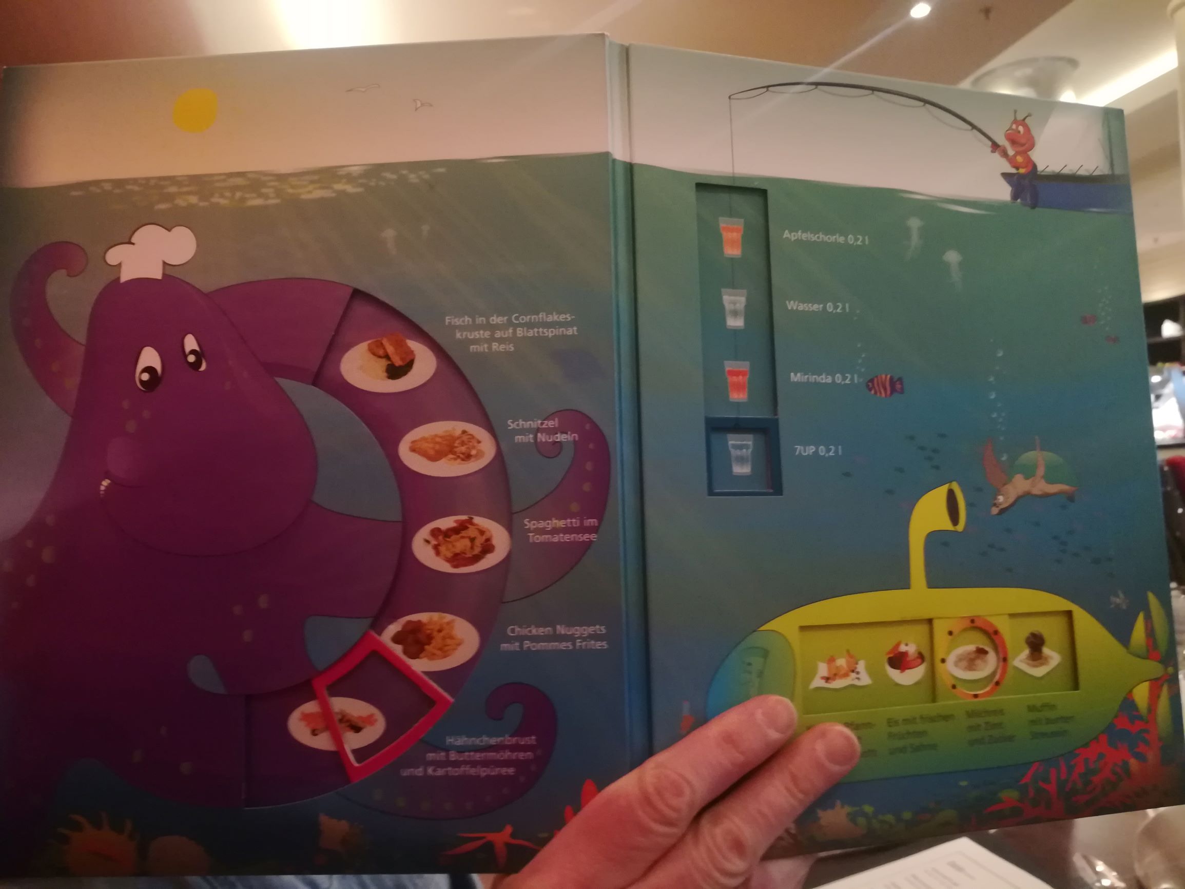 Aber noch sind wir ja hier im French Kiss und ich notiere mir, dass es hier – im Gegensatz zum Steakhouse und Casa Nova – für die Kinder eine Extra-Karte, die „Tiefseetaucher-Karte“ gibt, die wir auch schon vom letzten Jahr von der Prima kennen. Hier können sich die Kinder ihr Menü aus verschiedenen Hauptgerichten und Nachtischen selbst zusammenstellen.