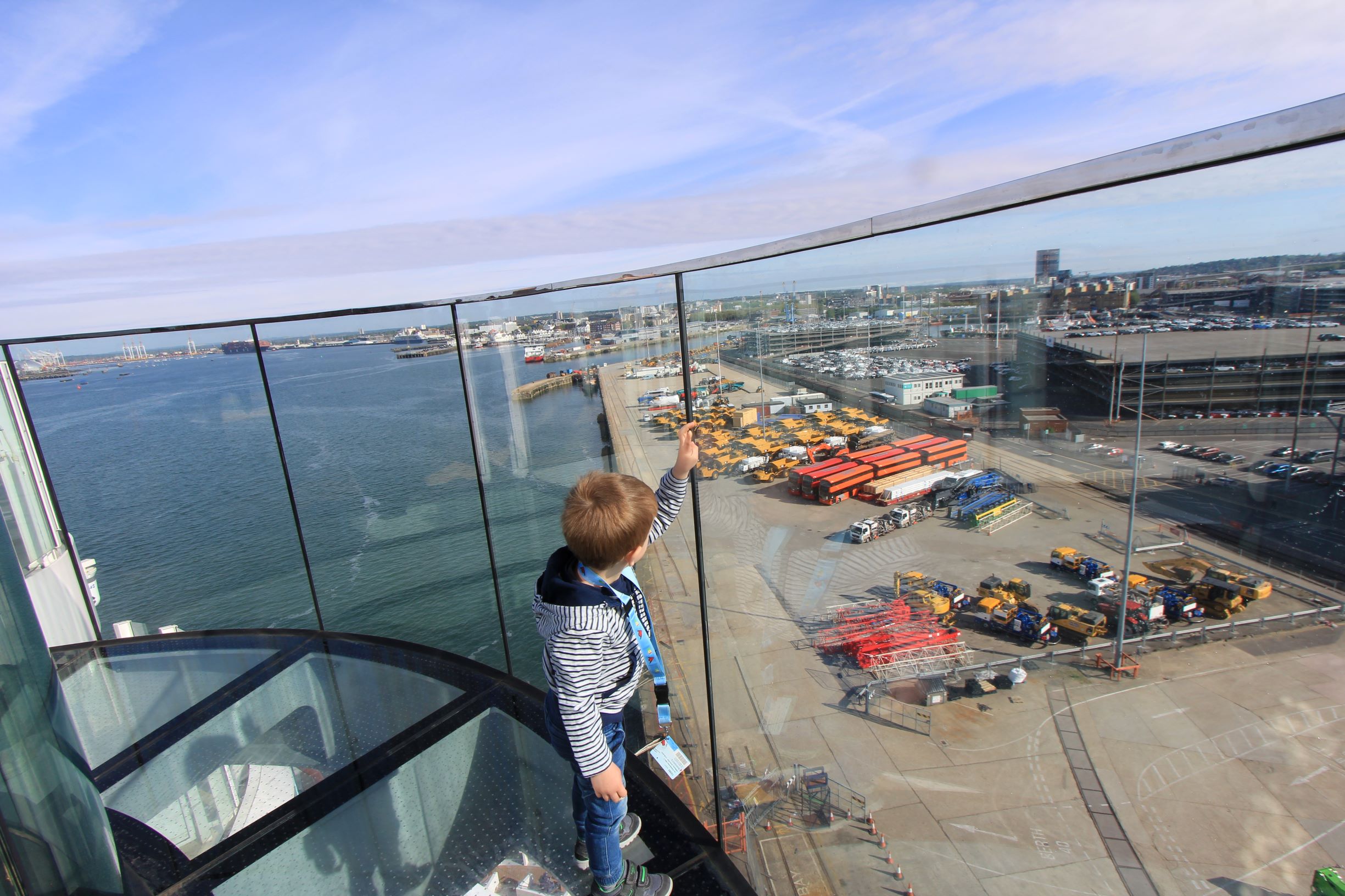 Danach machen wir noch einen Spaziergang auf dem Skywalk und Tom ist wieder ganz fasziniert vom Hafen und dem bunten Treiben tief unter uns.