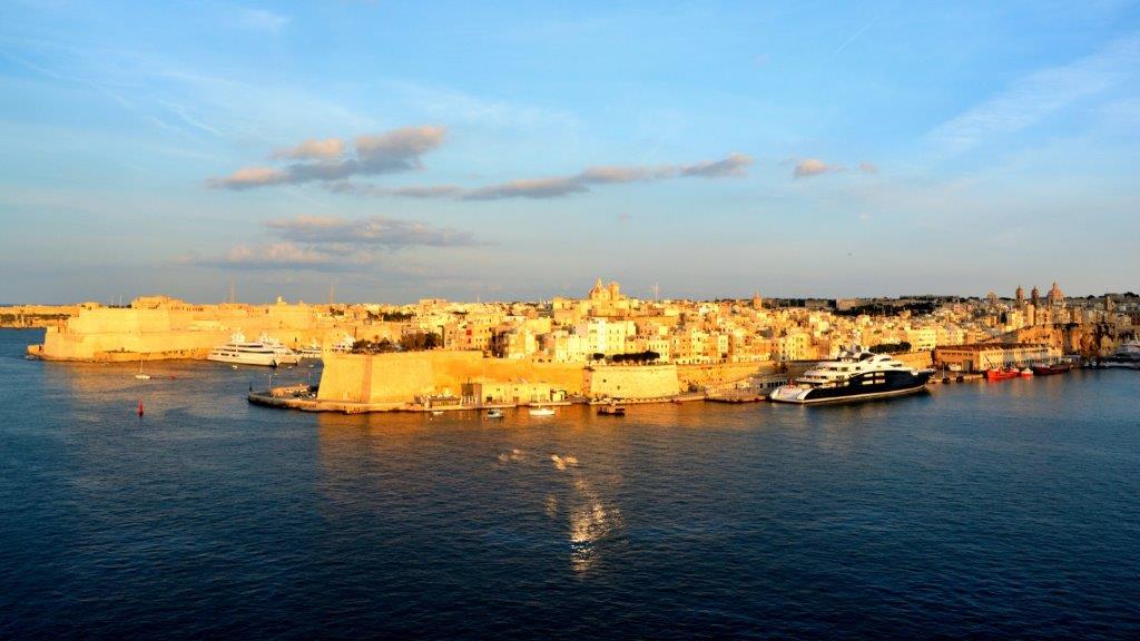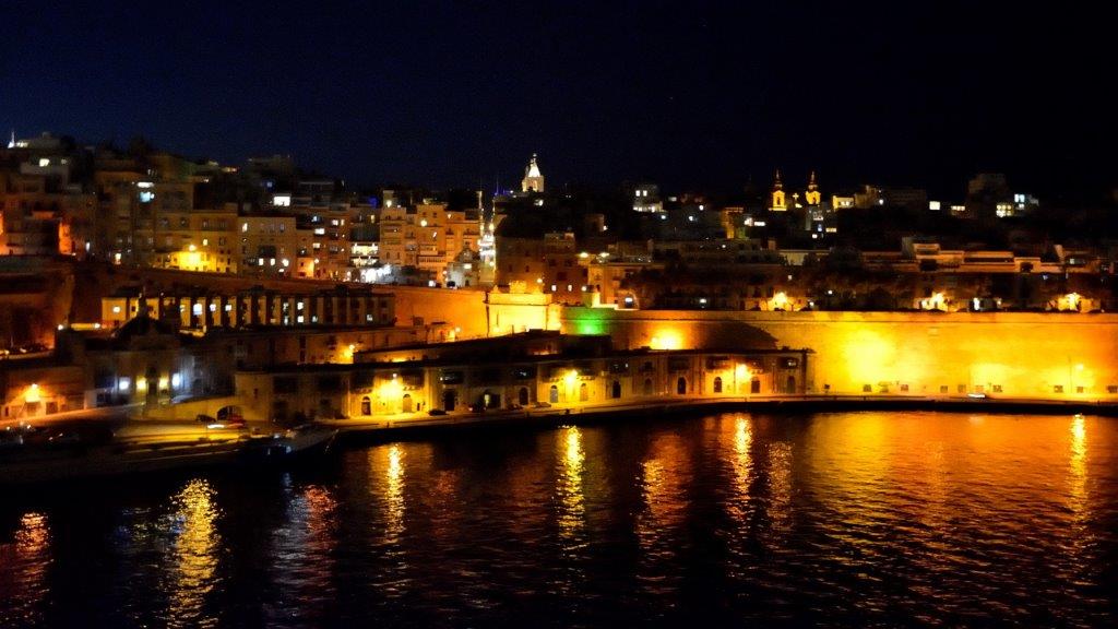 Auf einmal verschwand die Sonne und es wurde dunkel. 19 Uhr – Typhon – „Die große Freiheit“ machten darauf aufmerksam, dass das Auslaufen begonnen hatte. MeinSchiff 3 legte ab, drehte auf dem Handtuch und bewegte sich langsam Richtung Hafenausfahrt. Entlang der Reling war es rappelvoll. Wer wollte das schwer zu überbietende Verlassen von Valletta nicht miterleben?! Wir sahen kein Lichtermeer. Dafür Beleuchtung an den richtigen Stellen. Die Vendette und die St.Phillip's Church. Die einstigen Lagerhäuser an der Waterfront. Die rosa angestrahlte Auberge de Castille. Die Stadtmauern und das Gebäudegewimmel rund um die St. John’s Co-Kathedrale.