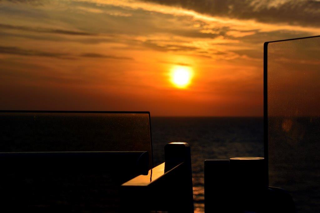 Gegen den stärkeren Wind konnten wir uns schützen und bleiben anschließend bis zum Sonnenuntergang auf Deck 14. Er kam. Schön, auch wenn die Schiebe nicht ins Meer versank …