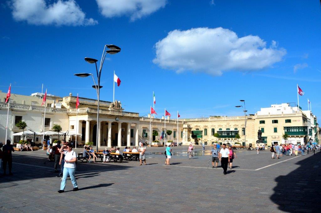 Vor einem nicht sehr hohen, dafür lang gestreckten Gebäude standen wir vor dem Sette Giugno Monument. Sette Giugno ist der Nationalfeiertag Maltas, der jährlich am 7. Juni begangen wird. An diesem Tag im Jahre 1919 schossen britische Truppen bei aufgrund von Lebensmittelknappheit entstandenen Unruhen auf die Protestierenden und töteten vier Bewohner Maltas. In dem lang gestreckten Gebäude, dem Großmeisterpalast, residierten seit Fertigstellung im 16. Jahrhundert die jeweiligen Machthaber wie Großmeister, britische Gouverneure und seit einigen Jahrzehnten maltesische Präsidenten. Wie die Kathedrale gab es an den Fassaden kaum Schmuck – dafür aber in den Räumlichkeiten … Wir wollten uns davon nicht überzeugen, denn die vor der Kasse anstehenden Menschenmassen überredeten uns … weiter … Und bevor wir uns abwandten, merkten wir, dass der Großmeisterpalast scharf bewacht wurde. Ein Grund, dass sich auf der anderen Seite des Palace Square die Credorax Bank breit gemacht hatte? Auch ein Palast?