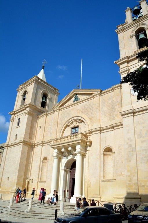 Jede Menge ältere Prachtbauten säumten die enge Straße. So eng, dass es schwierig war, Gebäude in Gänze aufzunehmen. Nach wenigen Minuten baute sich in einer Querstraße die St. John’s Co-Kathedrale, die spätere Hauptkirche des Ordens, vor uns auf.