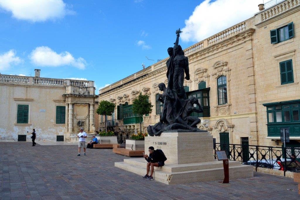 Vor einem nicht sehr hohen, dafür lang gestreckten Gebäude standen wir vor dem Sette Giugno Monument. Sette Giugno ist der Nationalfeiertag Maltas, der jährlich am 7. Juni begangen wird. An diesem Tag im Jahre 1919 schossen britische Truppen bei aufgrund von Lebensmittelknappheit entstandenen Unruhen auf die Protestierenden und töteten vier Bewohner Maltas. In dem lang gestreckten Gebäude, dem Großmeisterpalast, residierten seit Fertigstellung im 16. Jahrhundert die jeweiligen Machthaber wie Großmeister, britische Gouverneure und seit einigen Jahrzehnten maltesische Präsidenten. Wie die Kathedrale gab es an den Fassaden kaum Schmuck – dafür aber in den Räumlichkeiten … Wir wollten uns davon nicht überzeugen, denn die vor der Kasse anstehenden Menschenmassen überredeten uns … weiter … Und bevor wir uns abwandten, merkten wir, dass der Großmeisterpalast scharf bewacht wurde. Ein Grund, dass sich auf der anderen Seite des Palace Square die Credorax Bank breit gemacht hatte? Auch ein Palast?