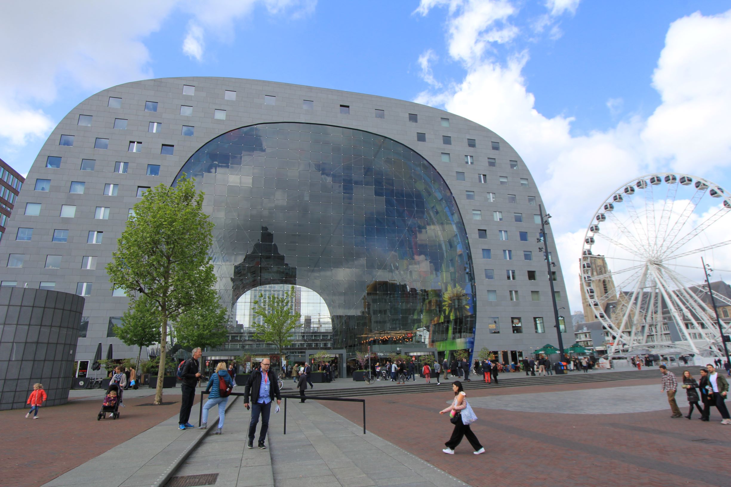 Neben der Markthalle ist ein Riesenrad ist zu sehen, eine schöne Kulisse.