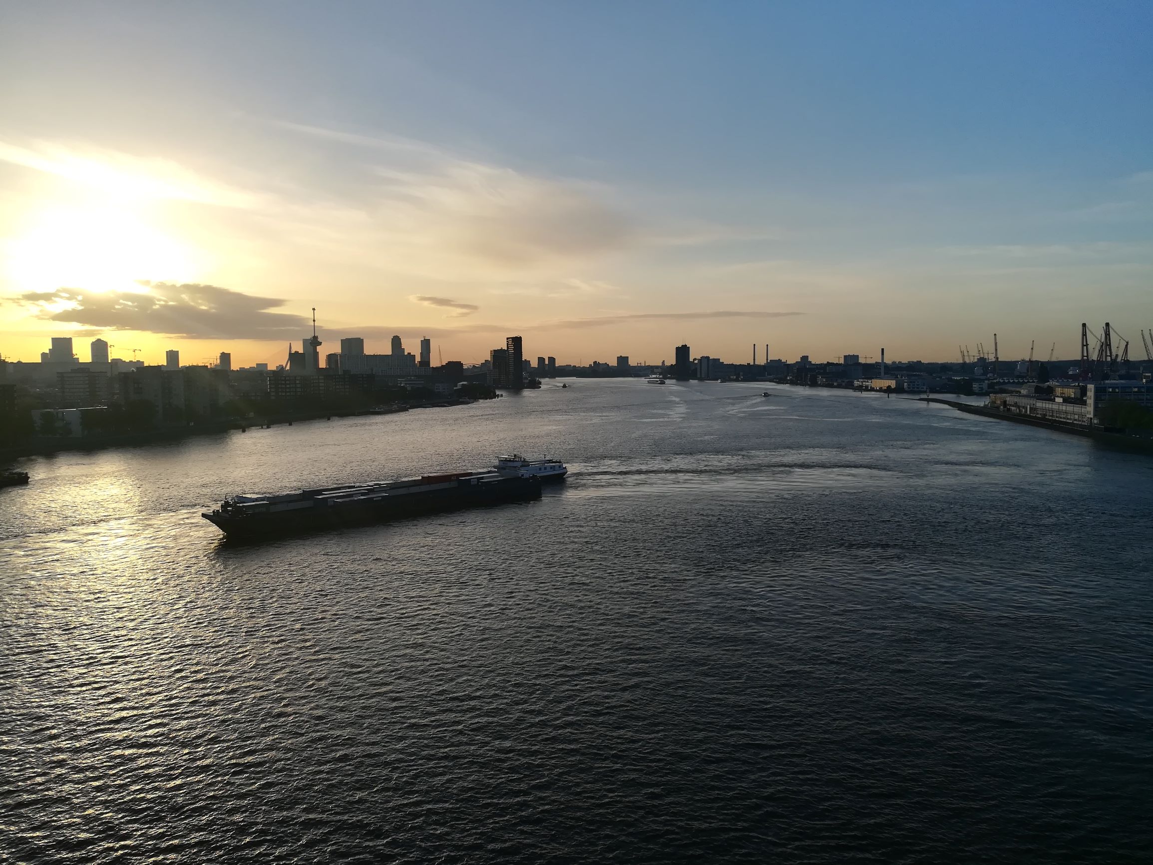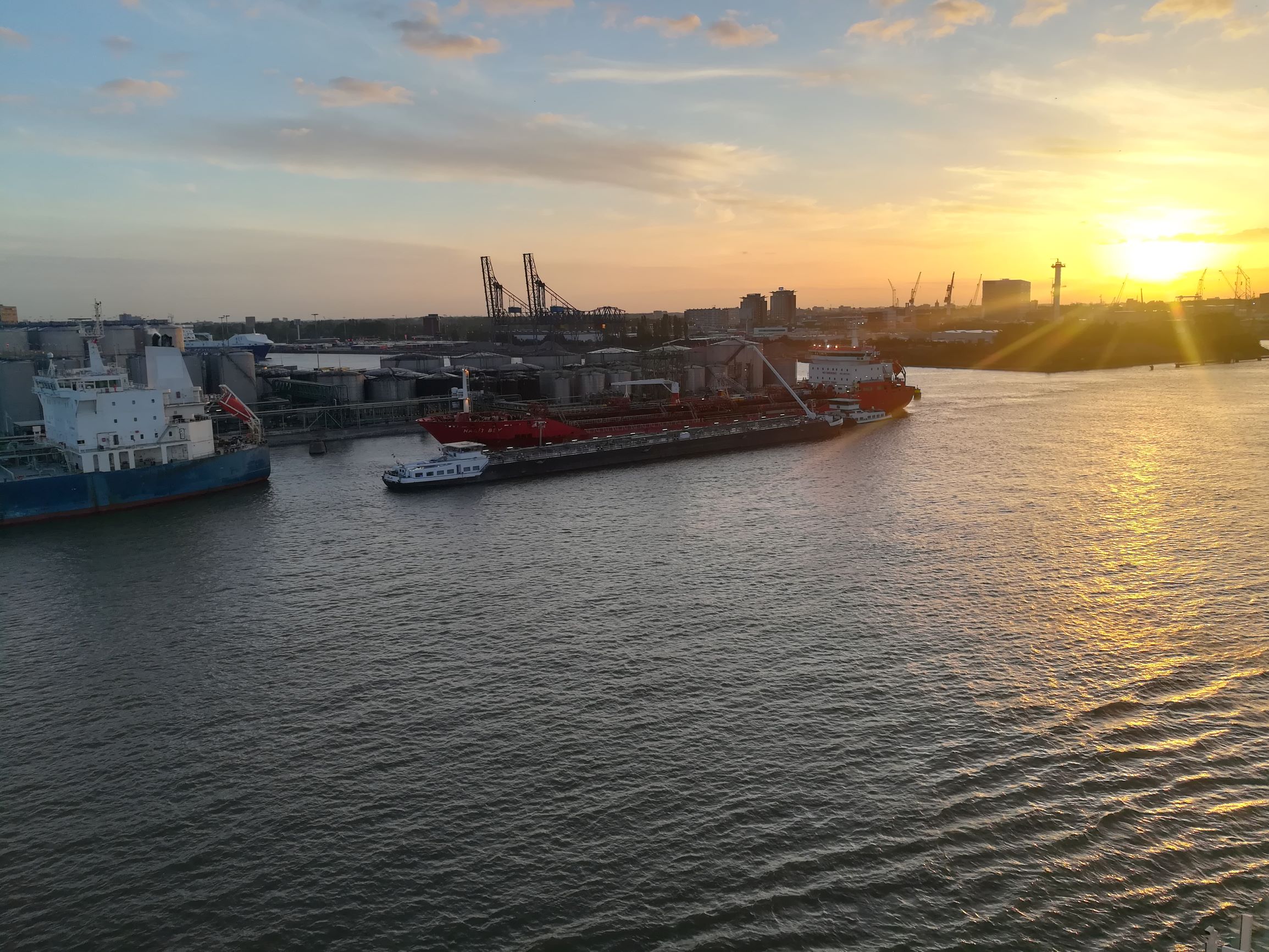 Eine gute Entscheidung, denn wir fahren gerade in den Rotterdamer Hafen ein und die Sonne geht auf.