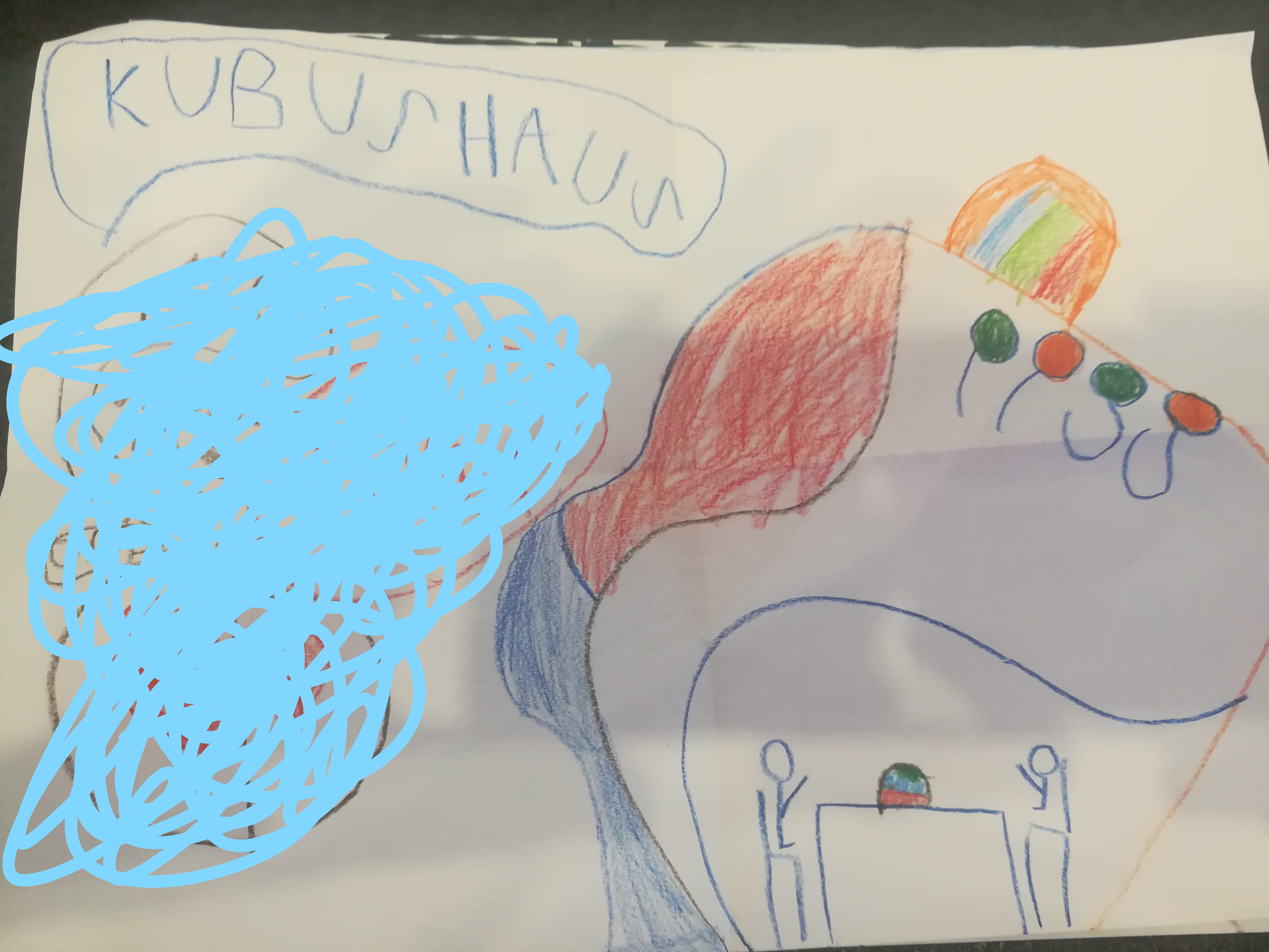 Dieses Erlebnis scheint sie sehr beeindruckt zu haben, denn in der Woche nach dem Urlaub brachte sie aus dem Kindergarten folgendes selbstgemaltes Bild mit (einen Teil des Bildes habe ich auf Ellas Wunsch hin unkenntlich gemacht, da er ihr ihrer Meinung nach nicht so gut gelungen ist):