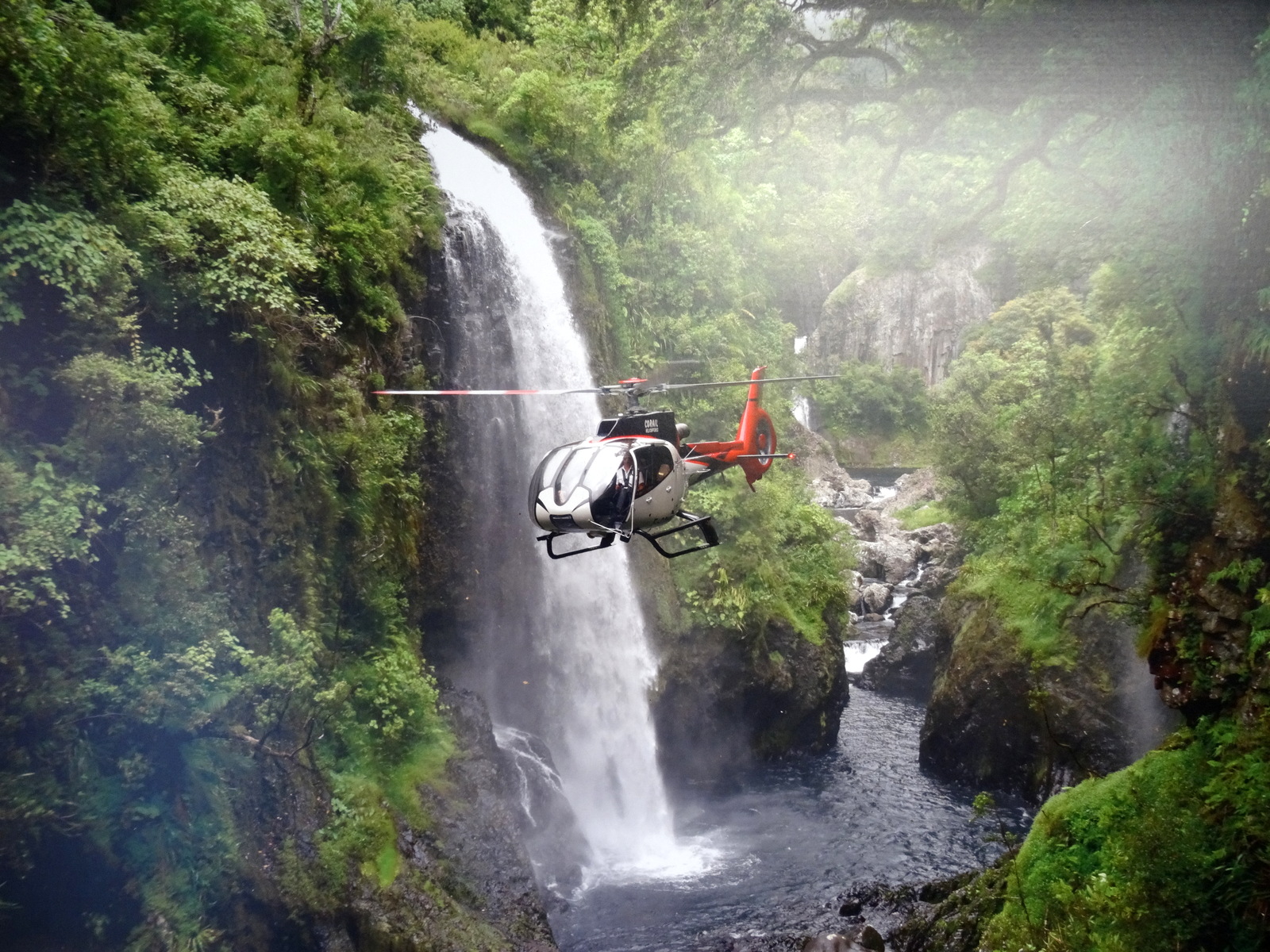 taucht der Heli jetzt in eine Talecke mit einem Wasserfall ein.