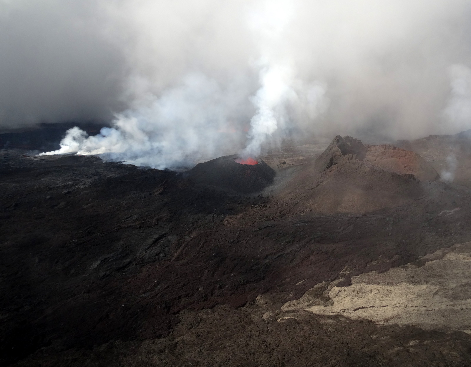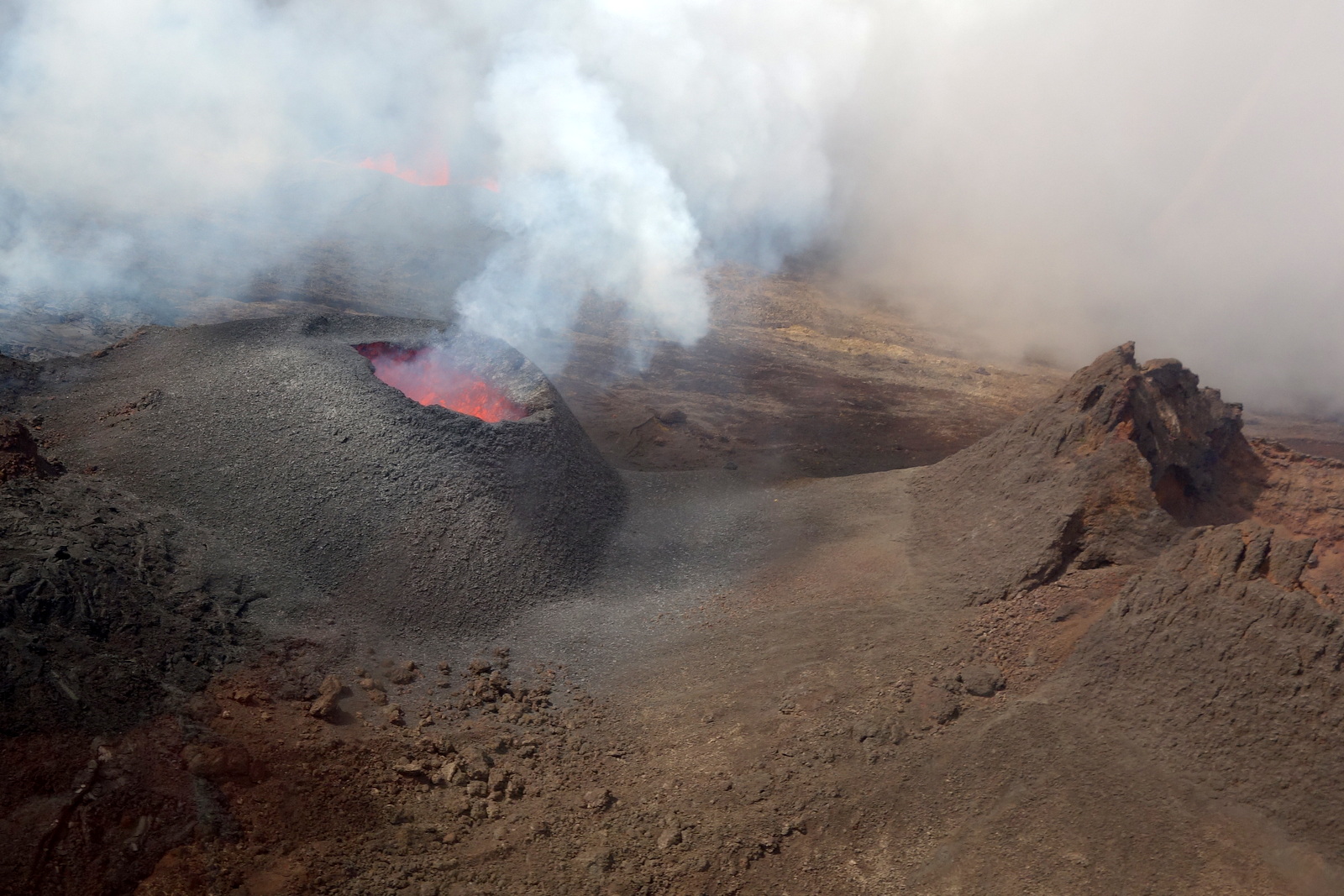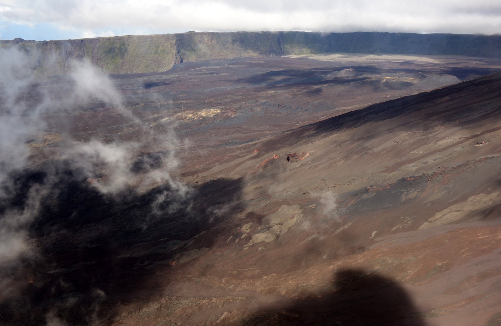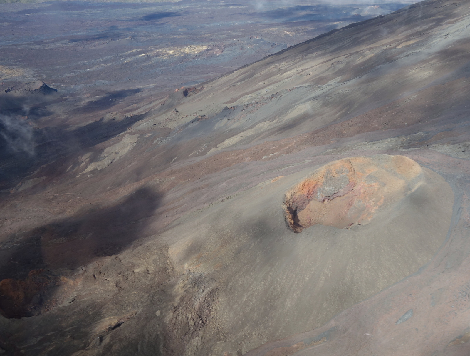 Das war jetzt schon alles mehr als grandios, aber nun kommt noch die Sahnehaube oben drauf. Und die ist nicht aus Sahne, sondern flüssiges heißes Magma. 2600 m hoch ist er, der Vulkan „Piton de la Fournaise“. 2600m, das ist schon mächtig hoch. Insbesondere wenn man bedenkt, dass der Heli ja praktisch bei nahezu 0 m über dem Meeresspiegel gestartet ist. Und da unten, man kann es aus dem Kessel des Vulkanfeldes jetzt nicht sehen, hat der Teddy gestern noch gestanden, unten am Meer und har nach oben, auf das riesige erkaltete Lavafeld geschaut. Die wahre Höhe des Vulkans konnte ich dabei gar nicht erkennen. Dazu braucht man einen ganz anderen Winkel. Man muss auf das Meer raus, um überhaupt den Gipfel zu sehen, –oder eben hochfliegen.